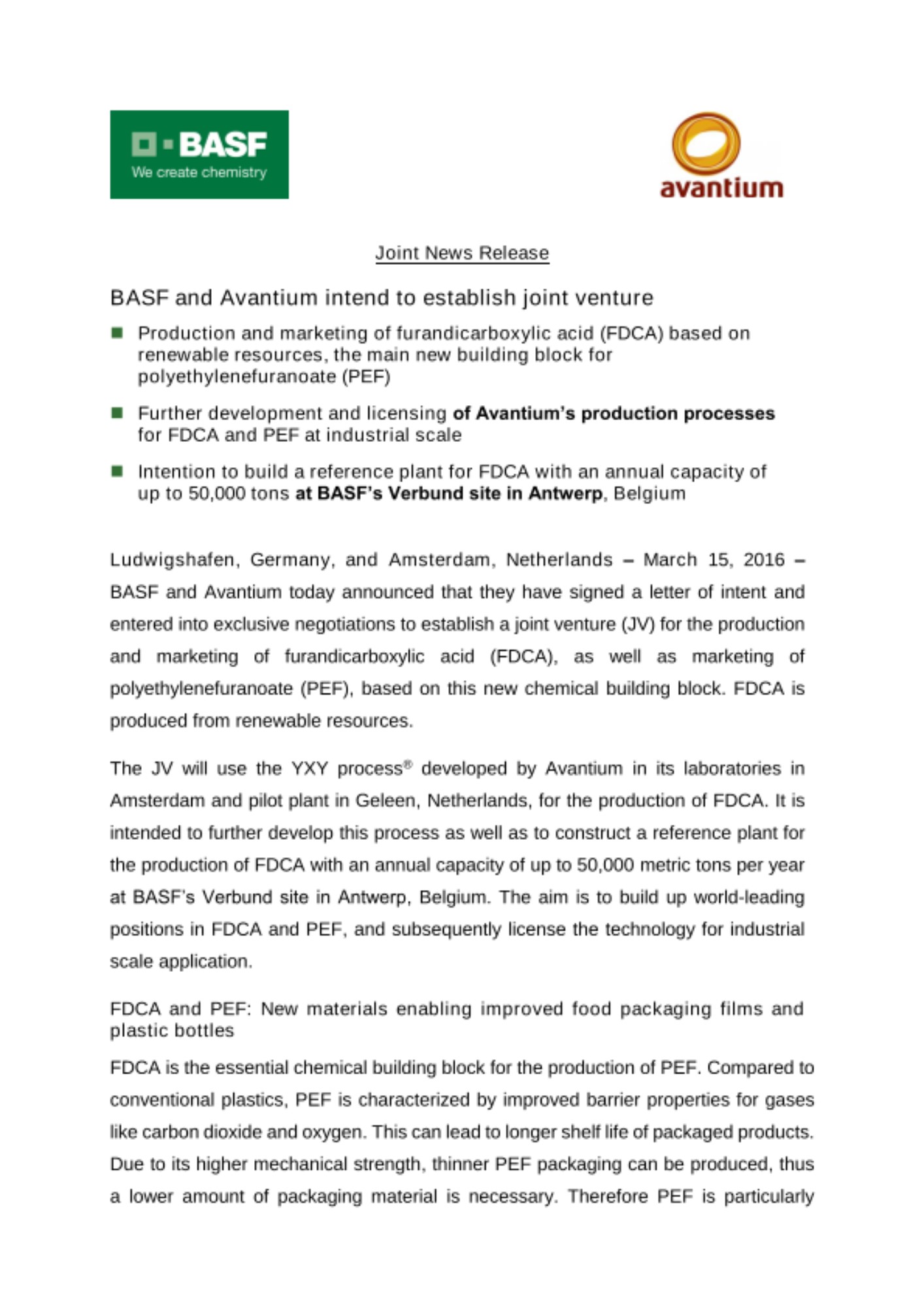 Ludwigshafen, Germany, and Amsterdam, Netherlands – March 15, 2016 – BASF and Avantium today announced that they have signed a letter of intent and entered into exclusive negotiations to establish a joint venture (JV) for the production and marketing of furandicarboxylic acid (FDCA), as well as marketing of polyethylenefuranoate (PEF), based on this new chemical building block. FDCA is produced from renewable resources.