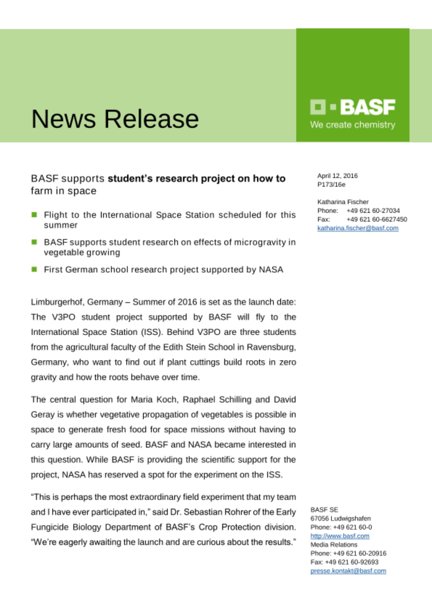Limburgerhof, Germany – Summer of 2016 is set as the launch date: The V3PO student project supported by BASF will fly to the International Space Station (ISS). Behind V3PO are three students from the agricultural faculty of the Edith Stein School in Ravensburg, Germany, who want to find out if plant cuttings build roots in zero gravity and how the roots behave over time.