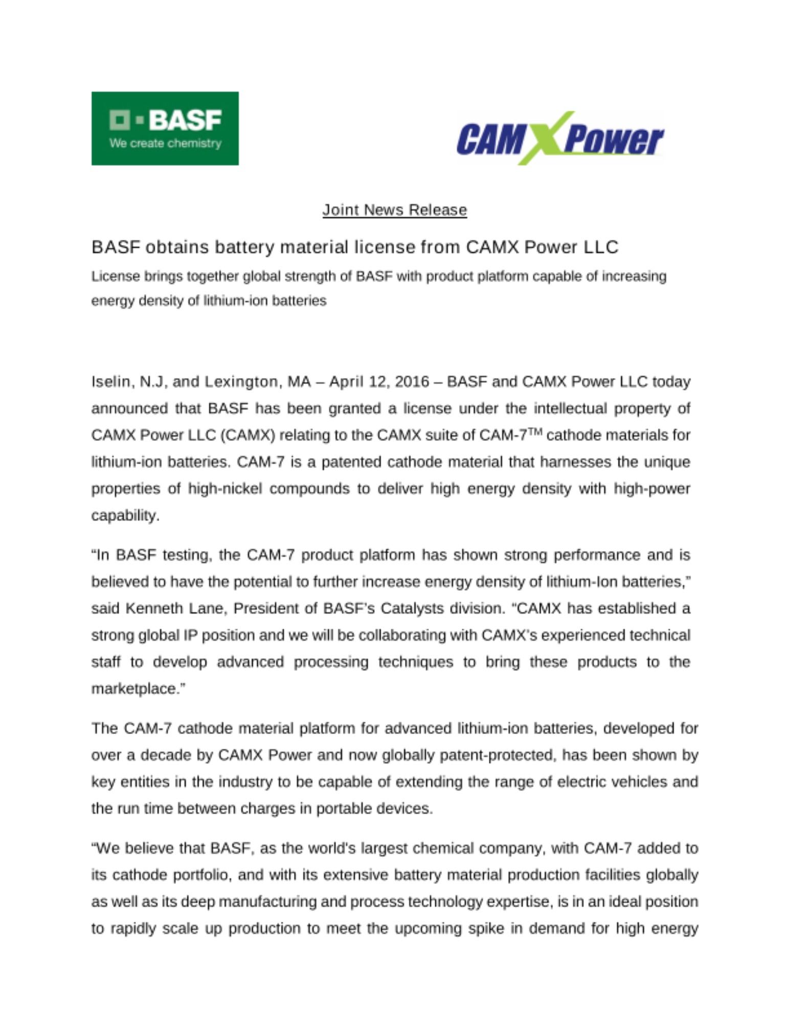 Iselin, N.J, and Lexington, MA – April 12, 2016 – BASF and CAMX Power LLC today announced that BASF has been granted a license under the intellectual property of CAMX Power LLC (CAMX) relating to the CAMX suite of CAM-7TM cathode materials for lithium-ion batteries. CAM-7 is a patented cathode material that harnesses the unique properties of high-nickel compounds to deliver high energy density with high-power capability.