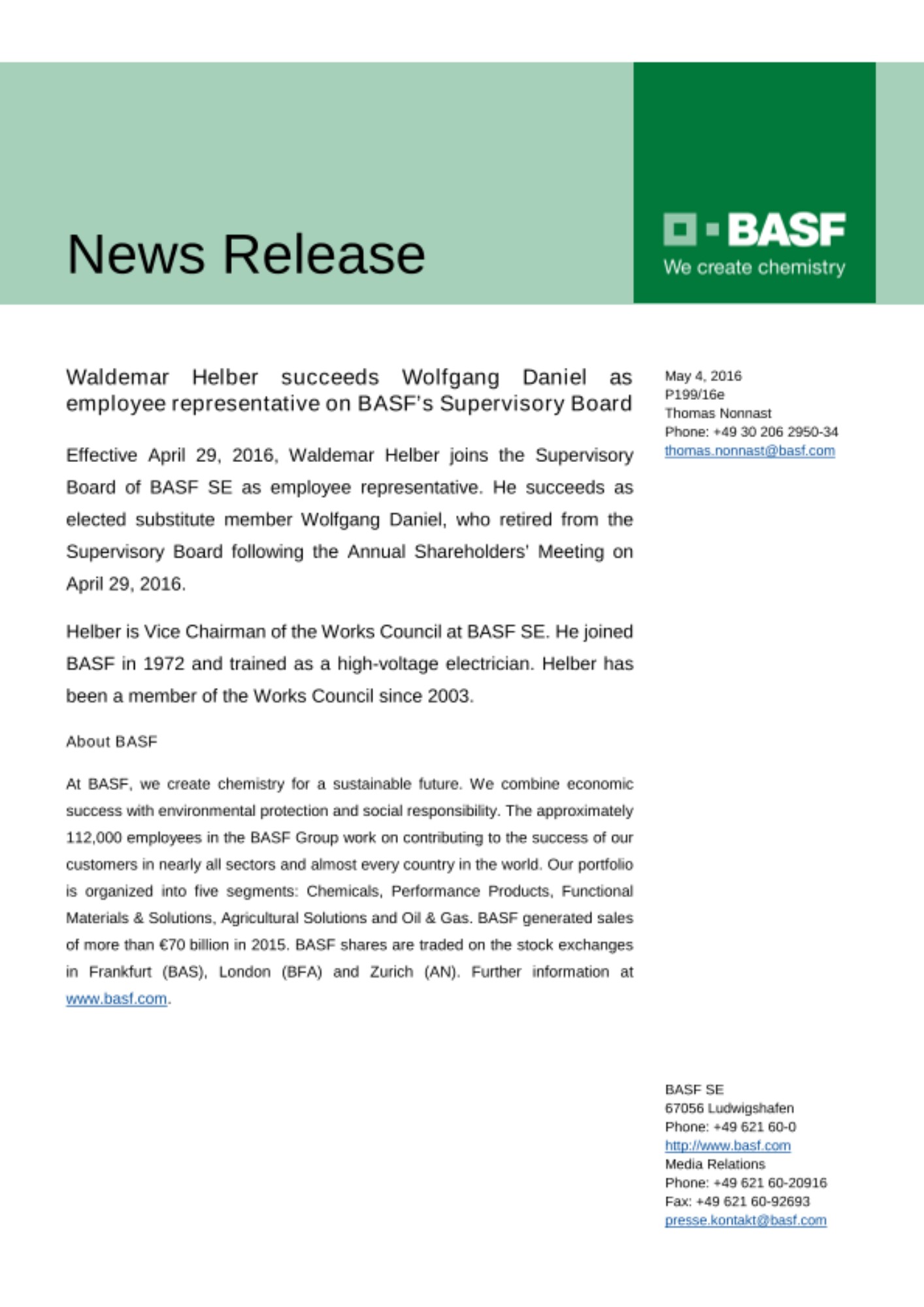 Effective April 29, 2016, Waldemar Helber joins the Supervisory Board of BASF SE as employee representative. He succeeds as elected substitute member Wolfgang Daniel, who retired from the Supervisory Board following the Annual Shareholders’ Meeting on April 29, 2016.