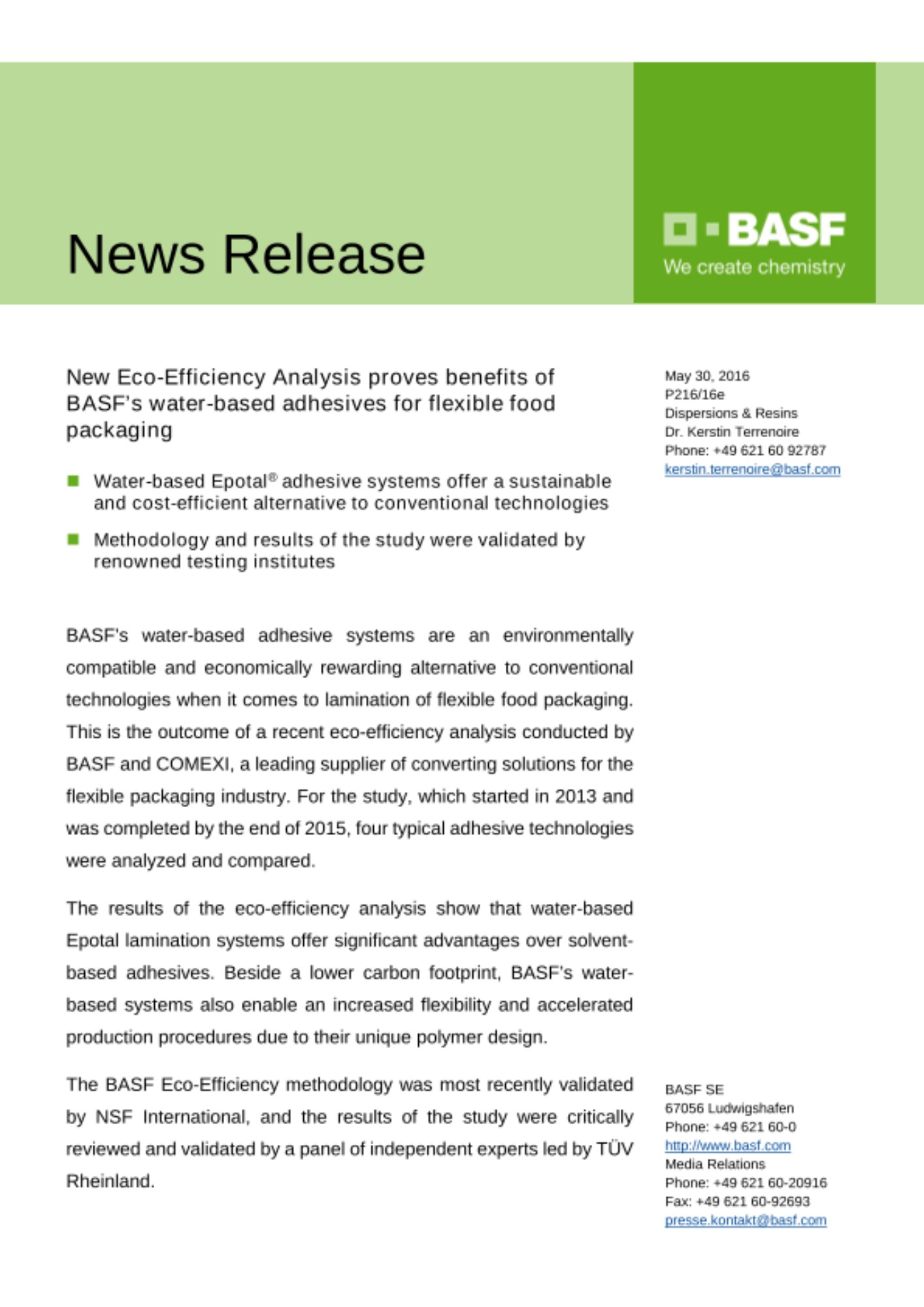 New Eco-Efficiency Analysis proves benefits of BASF’s water-based adhesives for flexible food packaging