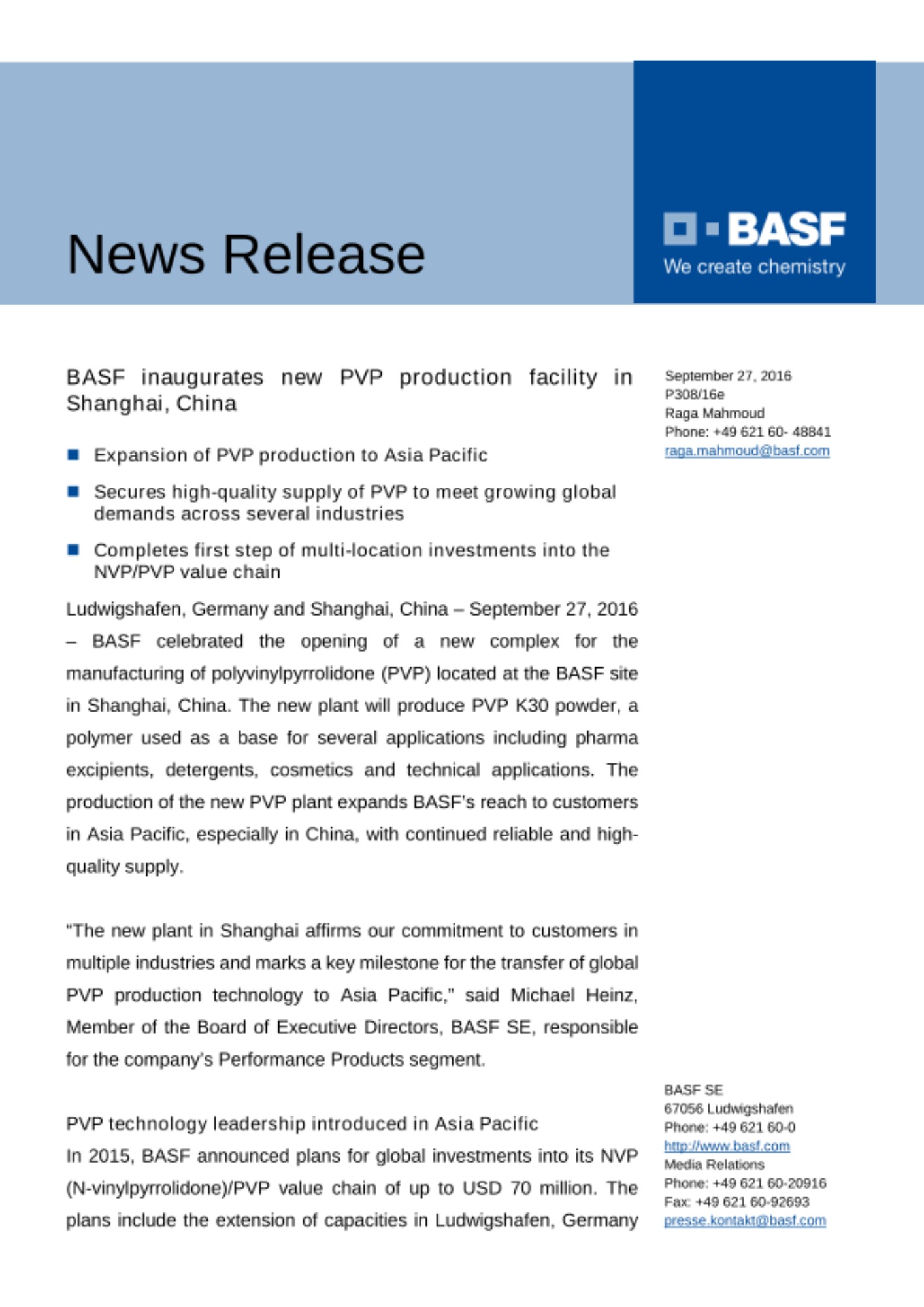 “The new plant in Shanghai affirms our commitment to customers in multiple industries and marks a key milestone for the transfer of global PVP production technology to Asia Pacific,” said Michael Heinz, Member of the Board of Executive Directors, BASF SE, responsible for the company’s Performance Products segment.