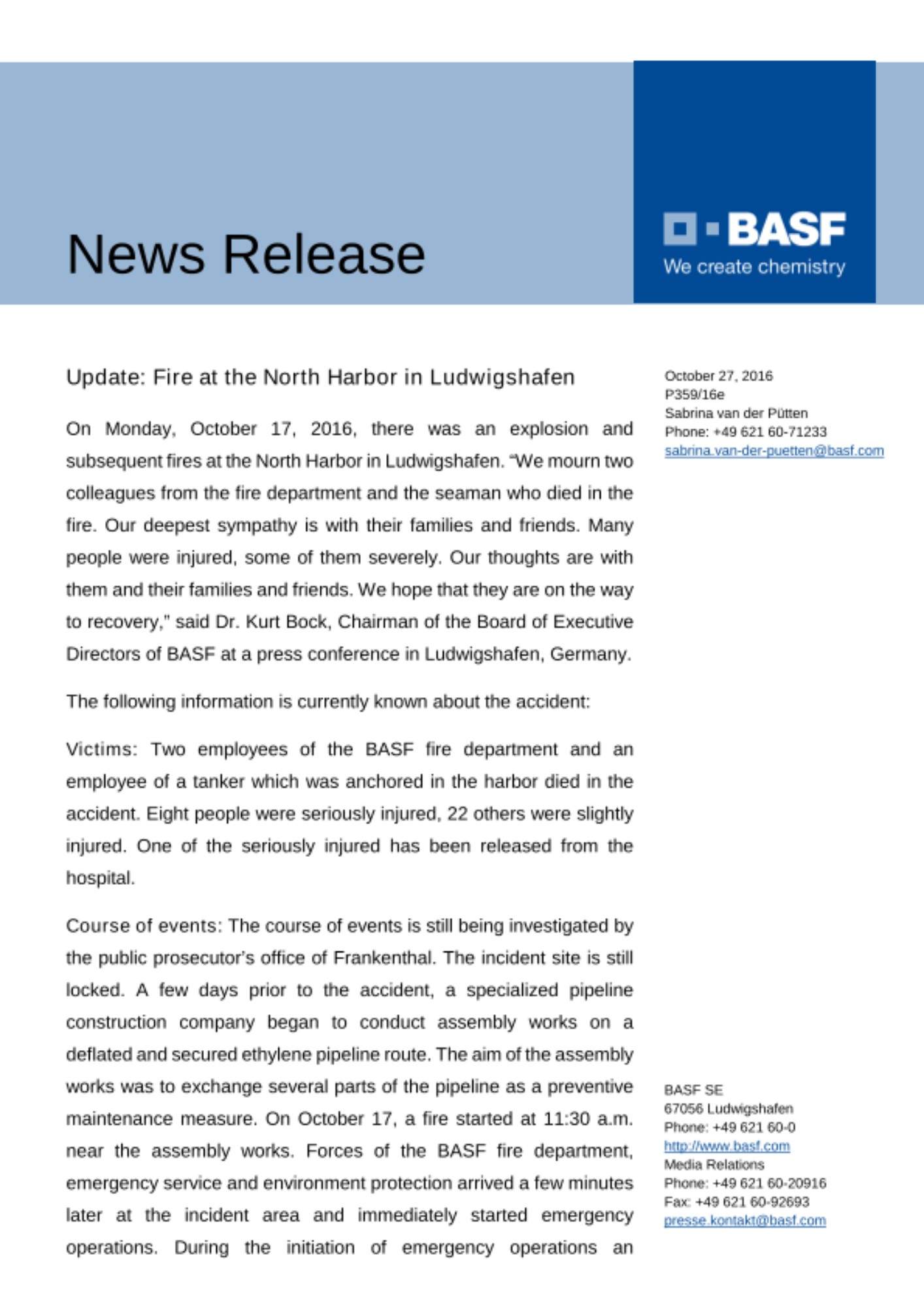 On Monday, October 17, 2016, there was an explosion and subsequent fires at the North Harbor in Ludwigshafen. “We mourn two colleagues from the fire department and the seaman who died in the fire. Our deepest sympathy is with their families and friends. Many people were injured, some of them severely. Our thoughts are with them and their families and friends. We hope that they are on the way to recovery,” said Dr. Kurt Bock, Chairman of the Board of Executive Directors of BASF at a press conference in Ludwigshafen, Germany.