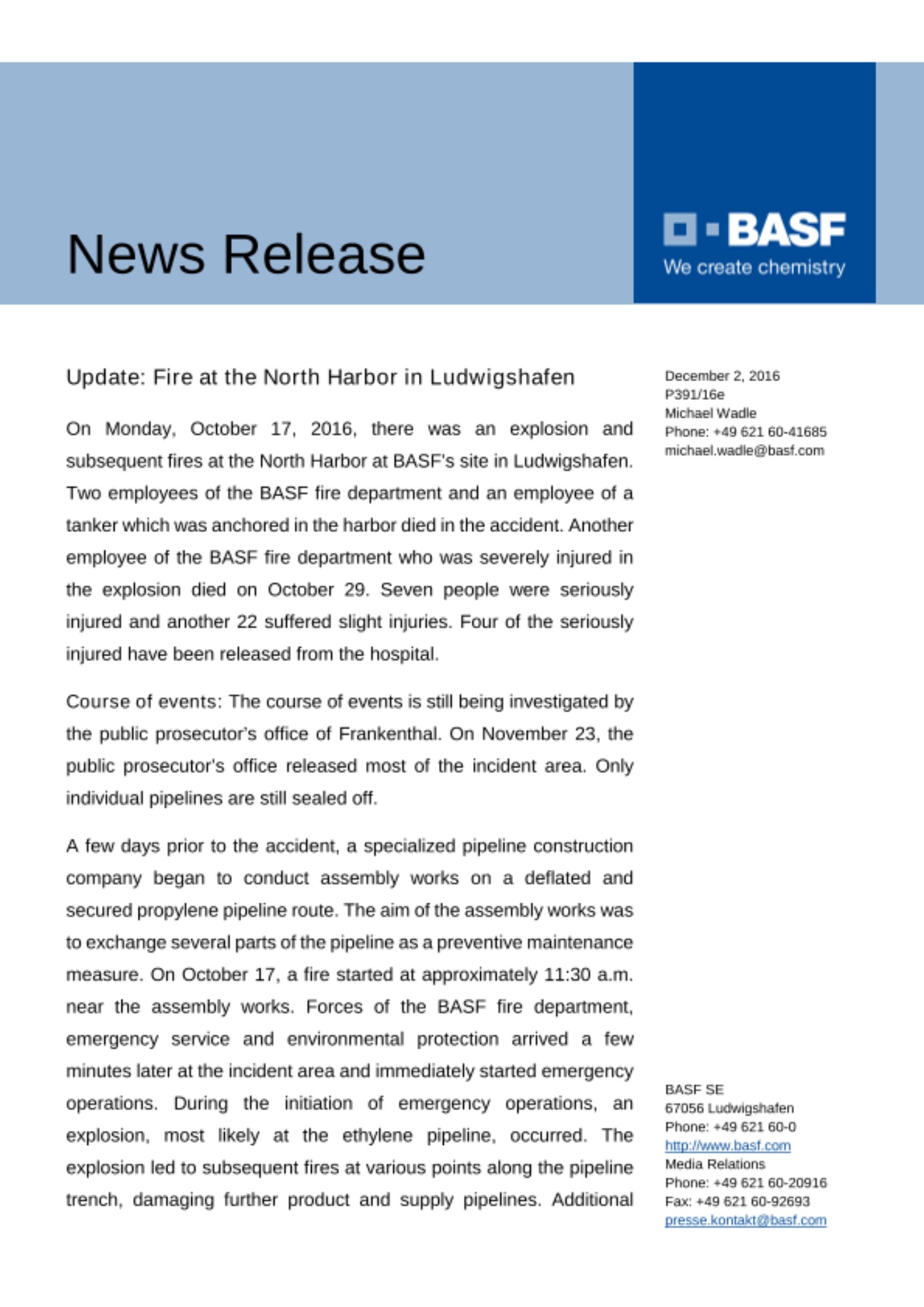 On Monday, October 17, 2016, there was an explosion and subsequent fires at the North Harbor at BASF’s site in Ludwigshafen. Two employees of the BASF fire department and an employee of a tanker which was anchored in the harbor died in the accident. Another employee of the BASF fire department who was severely injured in the explosion died on October 29. Seven people were seriously injured and another 22 suffered slight injuries. Four of the seriously injured have been released from the hospital.