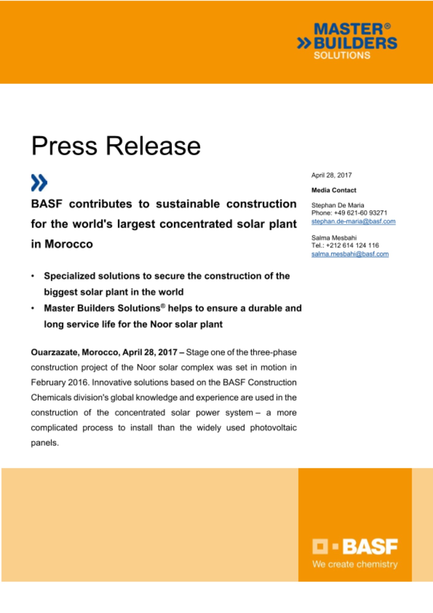 In cooperation with BASF, special tests were performed resulting in the selection of the most effective type of concrete and grout as well as the suitable application method for the products used in the construction of the solar complex. “For most of the big projects, customers benefit from the broad experience and connectedness of our experts in Africa and Europe, and they receive a comprehensive package of services and advice. This simplifies the construction process and ensures timely completion even of time-critical projects,” says Adil El Maaiche, BASF’s Admixture Systems Manager in Morocco.