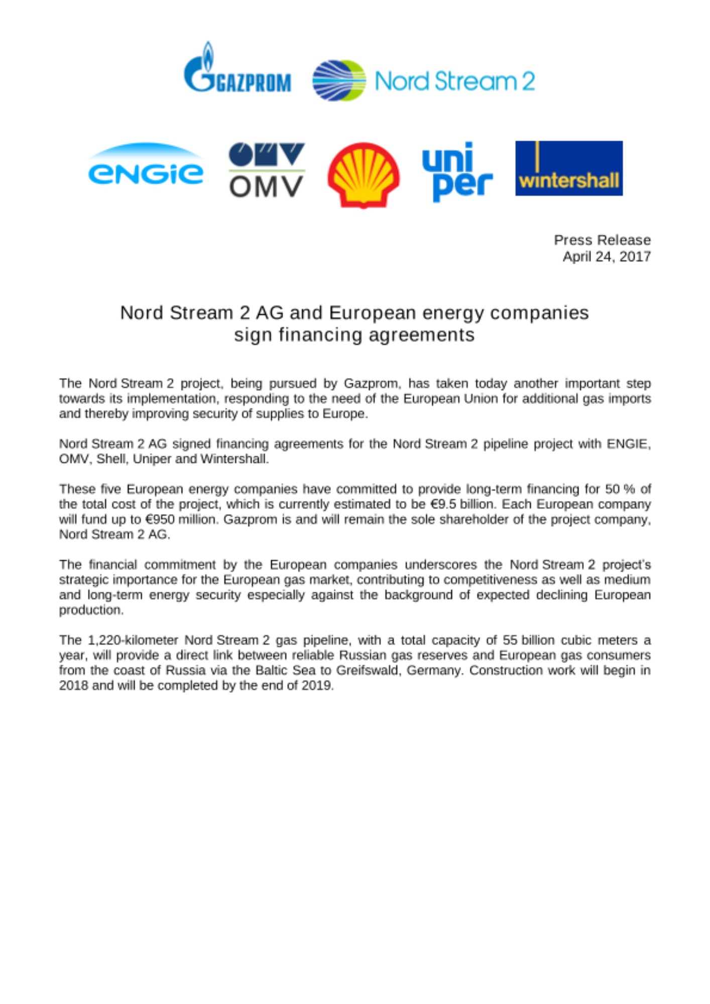 Nord Stream 2 AG signed financing agreements for the Nord Stream 2 pipeline project with ENGIE, OMV, Shell, Uniper and Wintershall.