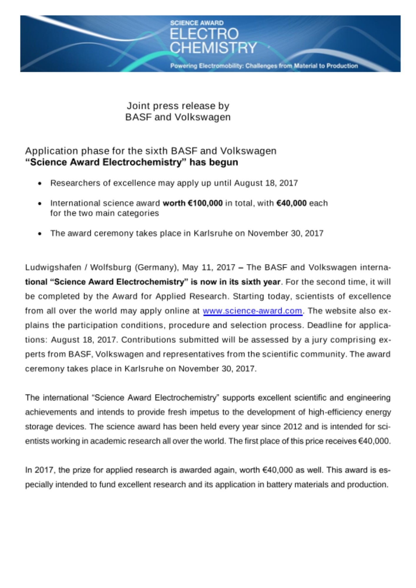 Ludwigshafen / Wolfsburg (Germany), May 11, 2017 – The BASF and Volkswagen international “Science Award Electrochemistry” is now in its sixth year. For the second time, it will be completed by the Award for Applied Research. Starting today, scientists of excellence from all over the world may apply online at www.science-award.com. The website also explains the participation conditions, procedure and selection process. Deadline for applications: August 18, 2017. Contributions submitted will be assessed by a jury comprising experts from BASF, Volkswagen and representatives from the scientific community. The award ceremony takes place in Karlsruhe on November 30, 2017.