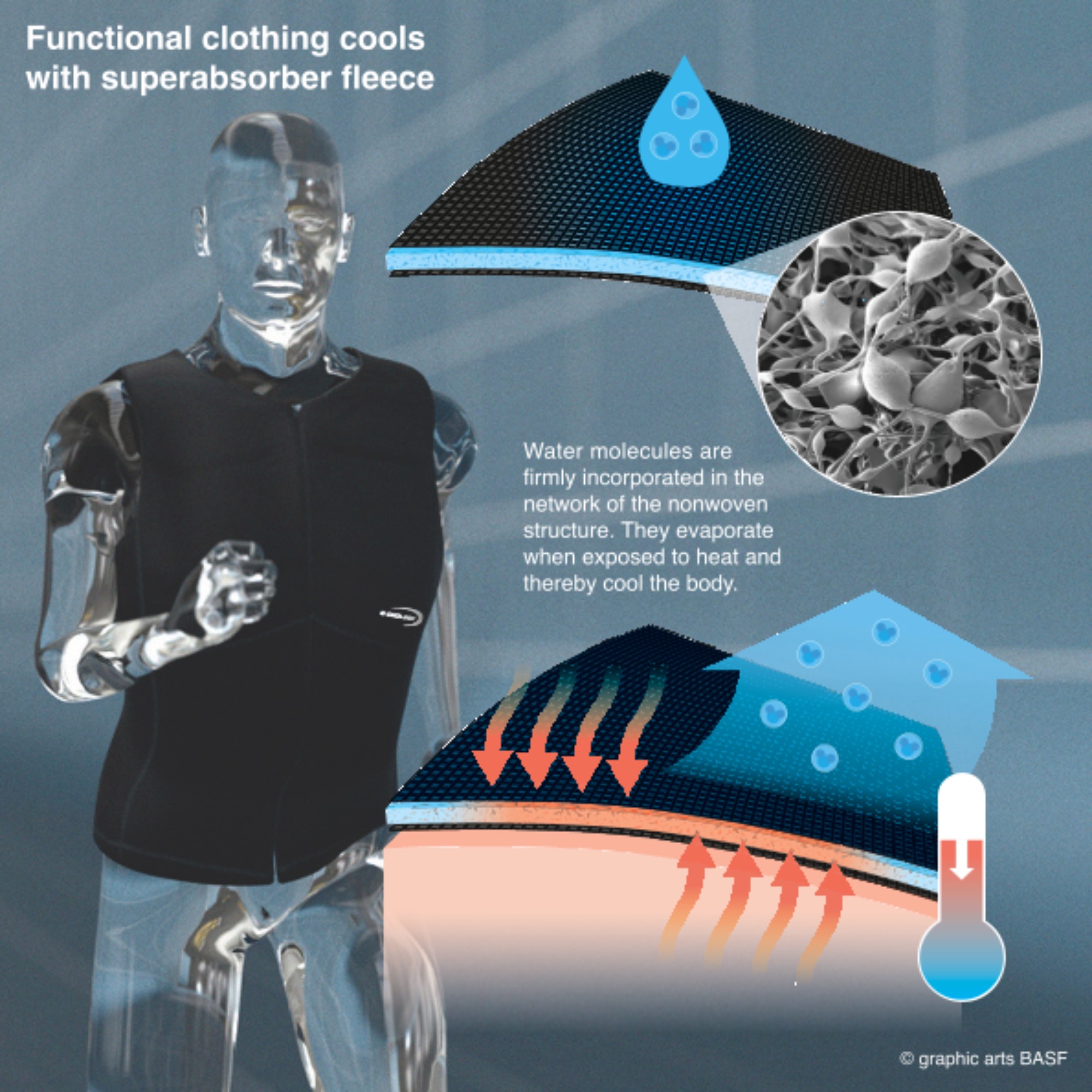 Functional cooling textiles of core sports and occupational safety brands use a special superabsorber fleece from BASF
