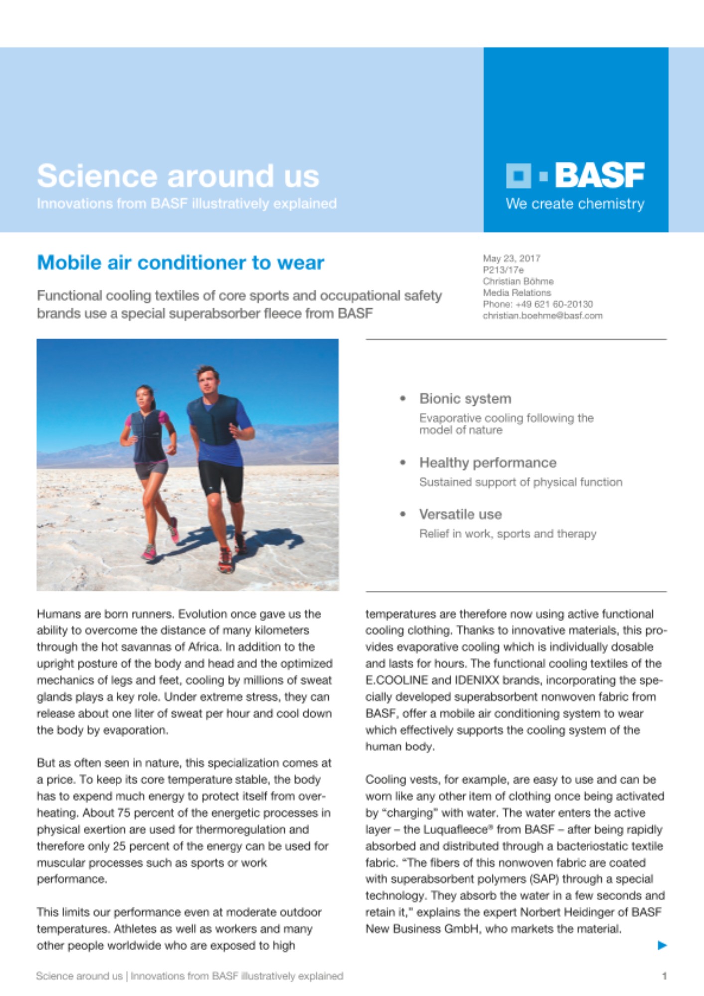 This limits our performance even at moderate outdoor temperatures. Athletes as well as workers and many other people worldwide who are exposed to high temperatures are therefore now using active functional cooling clothing. Thanks to innovative materials, this provides evaporative cooling which is individually dosable and lasts for hours. The functional cooling textiles of the E.COOLINE and IDENIXX brands, incorporating the specially developed superabsorbent nonwoven fabric from BASF, offer a mobile air conditioning system to wear which effectively supports the cooling system of the human body.