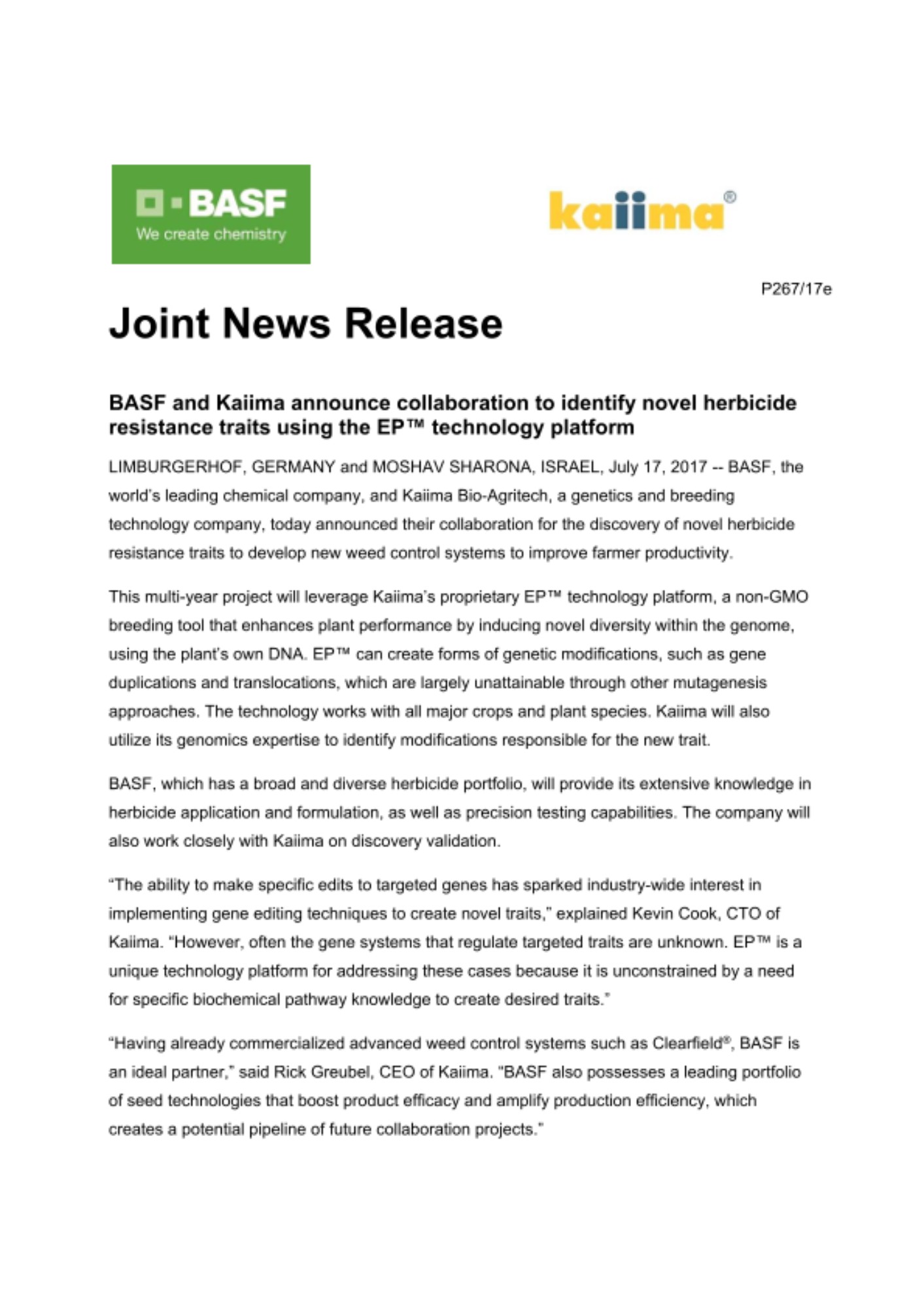 LIMBURGERHOF, GERMANY and MOSHAV SHARONA, ISRAEL, July 17, 2017 -- BASF, the world’s leading chemical company, and Kaiima Bio-Agritech, a genetics and breeding technology company, today announced their collaboration for the discovery of novel herbicide resistance traits to develop new weed control systems to improve farmer productivity.