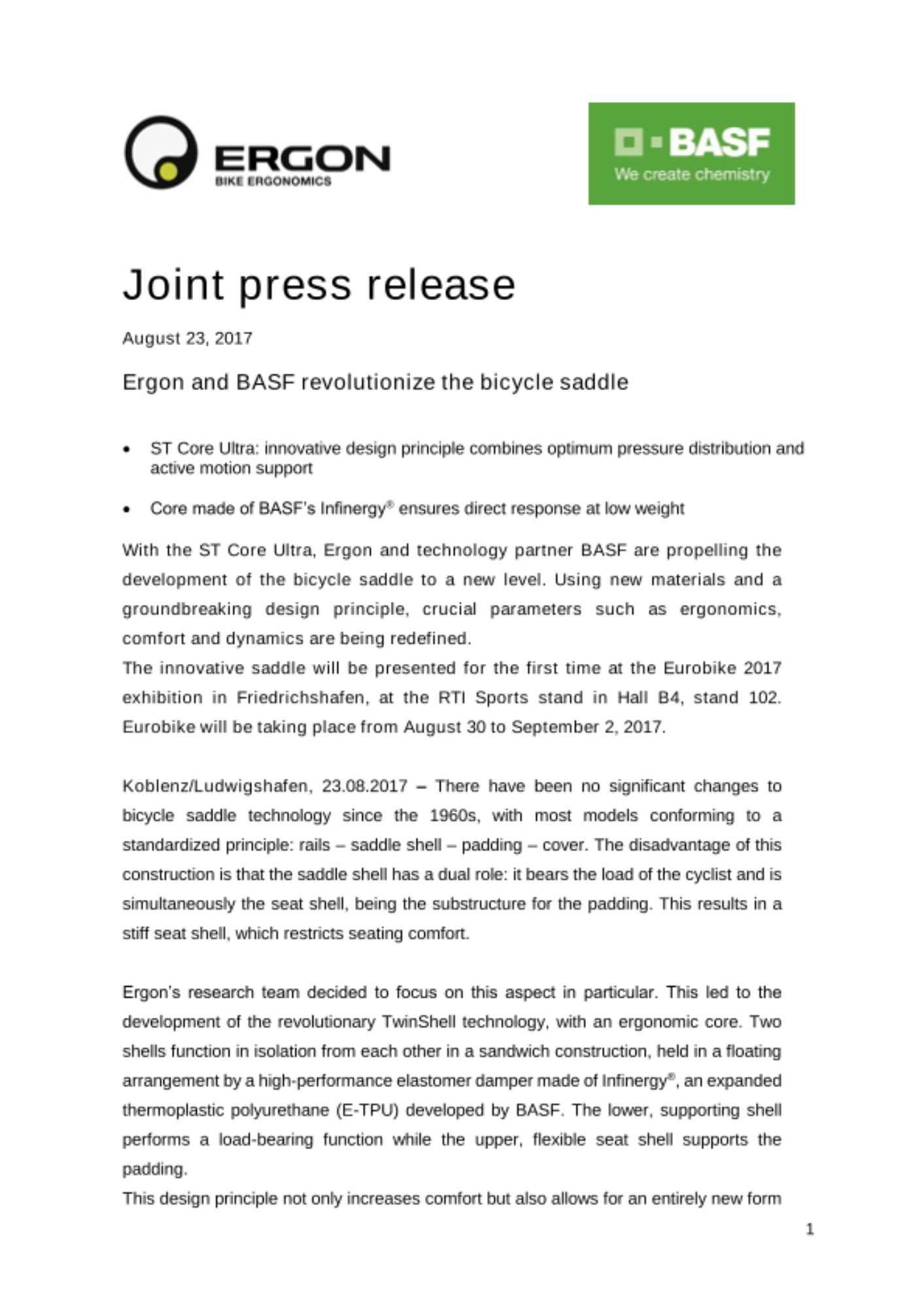 Franc Arnold, Ergon founder and chief executive, is convinced that the ST Core Ultra represents a huge triumph: “The idea of a design principle using TwinShell technology and an ergonomic core has been around for a while, but we were never able to find a suitable material on the market to implement this project. Now, Infinergy® from BASF has exceeded our expectations. I am absolutely certain that Ergon will cause a stir in the bicycle industry with its ST Core Ultra.”