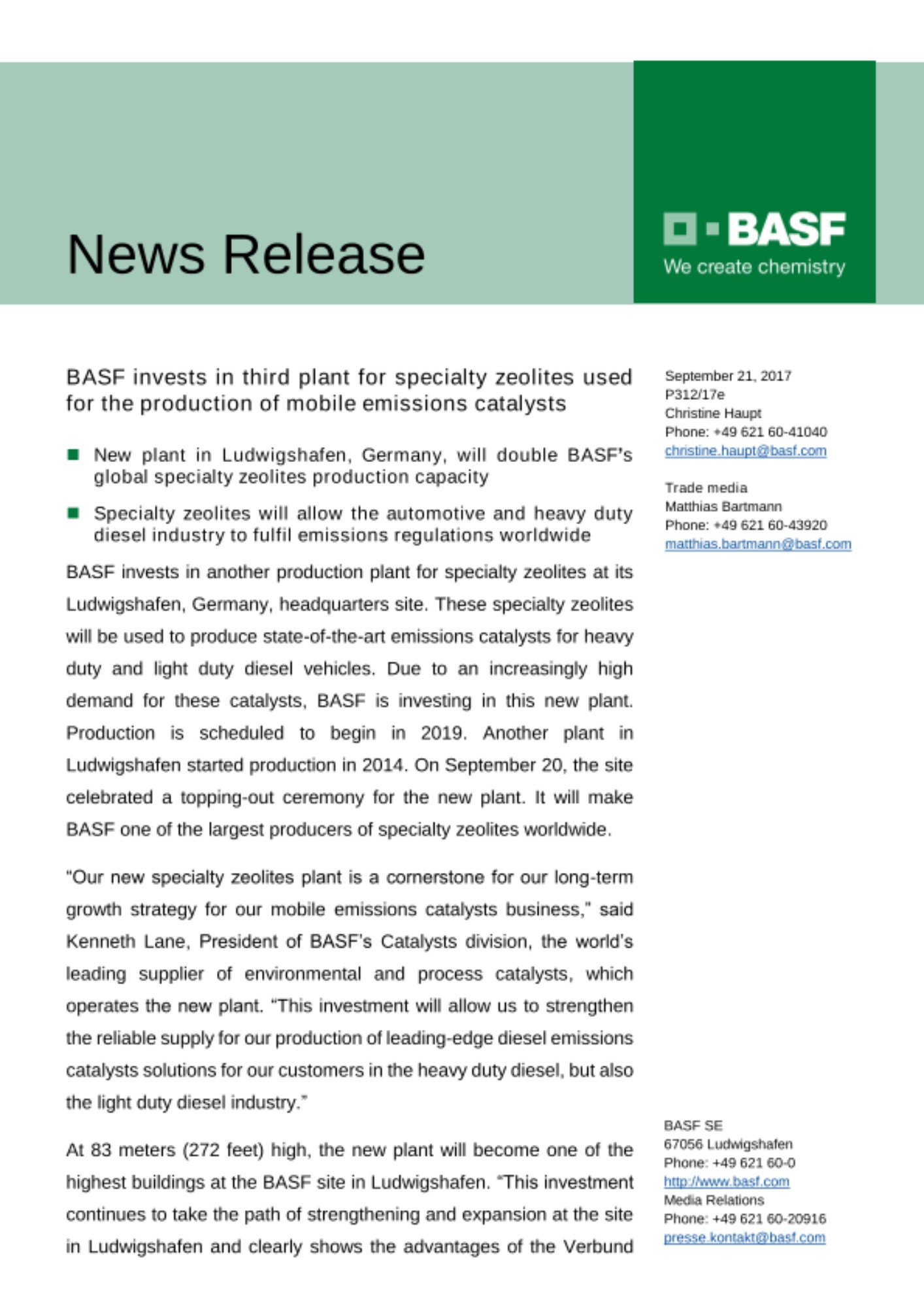BASF invests in third plant for specialty zeolites used for the production of mobile emissions catalysts