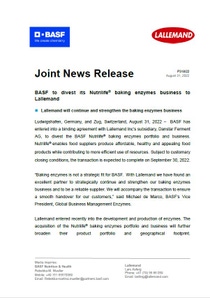 Ludwigshafen, Germany, and Zug, Switzerland, August 31, 2022 – BASF has entered into a binding agreement with Lallemand Inc’s subsidiary, Danstar Ferment AG, to divest the BASF Nutrilife® baking enzymes portfolio and business. Nutrilife® enables food suppliers produce affordable, healthy and appealing food products while contributing to more efficient use of resources. Subject to customary closing conditions, the transaction is expected to complete on September 30, 2022.