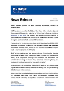 “We are committed to continuing the success story together with our North American MDI customers,” said Stefan Doerr, Senior Vice President, Monomers North America. “BASF is investing to support our customers in various industries with significant growth potential in MDI applications, including transportation, automotive, footwear and furniture.”