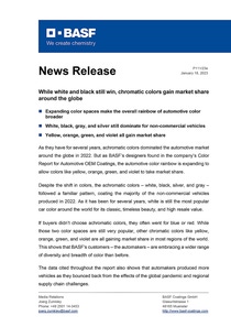 The BASF Color Report for Automotive OEM Coatings is a data analysis from BASF's Coatings division based on global automotive production and paint application to non-commercial vehicles in 2022.
