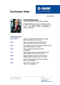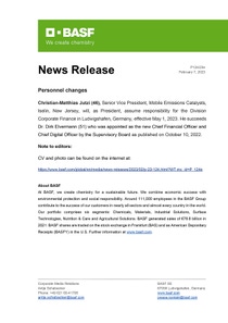 Christian-Matthias Jutzi (46), Senior Vice President, Mobile Emissions Catalysts, Iselin, New Jersey, will, as President, assume responsibility for the Division Corporate Finance in Ludwigshafen, Germany, effective May 1, 2023. He succeeds Dr. Dirk Elvermann (51) who was appointed as the new Chief Financial Officer and Chief Digital Officer by the Supervisory Board as published on October 10, 2022.