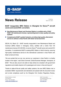 ISELIN, NJ, March 22 – BASF recently inaugurated a new Maintenance Repair and Overhaul (MRO) Station in Shanghai, China, certified with a CAAC Part 145 maintenance license (# D.200165), to service DeoxoTM aircraft ozone and ozone/VOC converters. It complements BASF’s existing MRO Station in North America, ensuring high-quality maintenance service to the international customers in Asia Pacific with faster turnaround times.