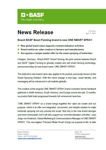 Cologne, Germany - Bosch BASF Smart Farming, the joint venture between Bosch and BASF Digital Farming to globally market and sell smart farming technology, announced today its new brand name: ONE SMART SPRAY.