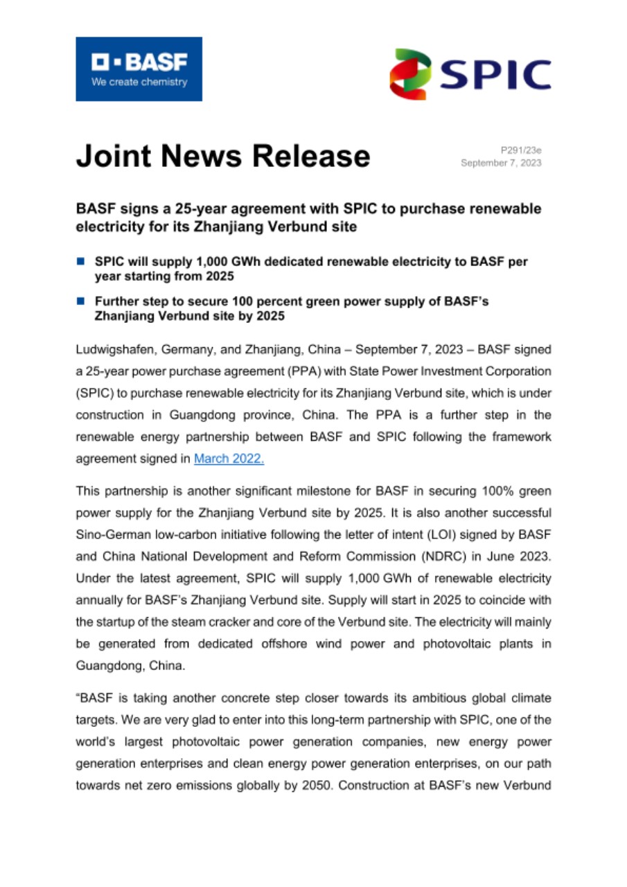 - SPIC will supply 1,000 GWh dedicated renewable electricity to BASF per year starting from 2025