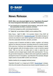 Paris, France – April 11, 2024 – At in-cosmetics Global in Paris, BASF will introduce its new digital service, “Ingredients Revealed”, that enables developers of personal care products to easily identify ingredients and formulations with specific criteria like sustainability information, standards, and labels.