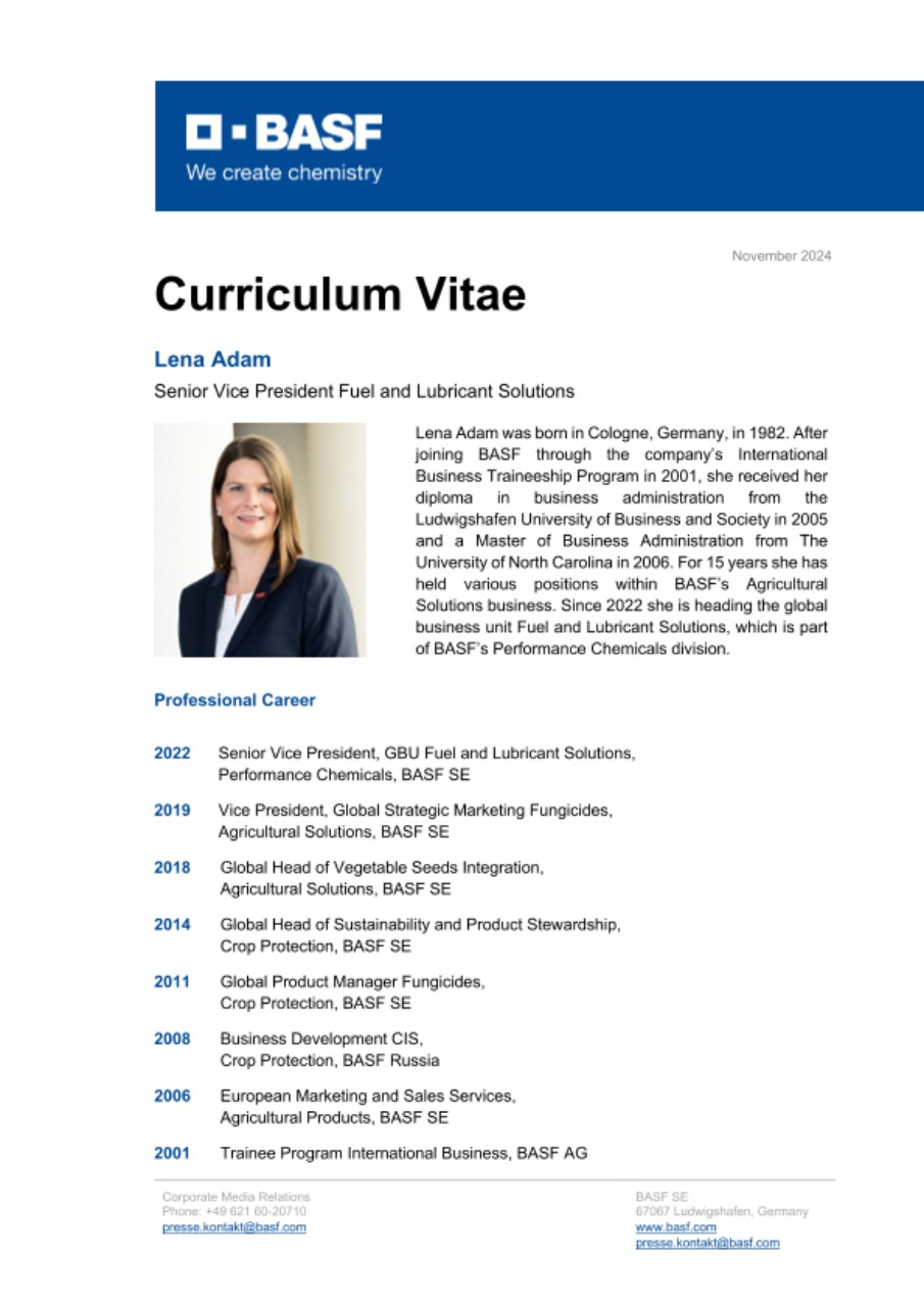 Lena Adam, Senior Vice President of Fuel & Lubricant Solutions, will, as President, succeed Dr. Thomas Kloster at the same time.