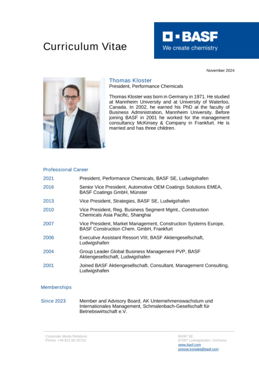 Dr. Thomas Kloster, President of the Performance Chemicals division at BASF, will assume responsibility for the Petrochemicals division based in Ludwigshafen on January 1, 2025. He succeeds Hartwig Michels, who will retire.