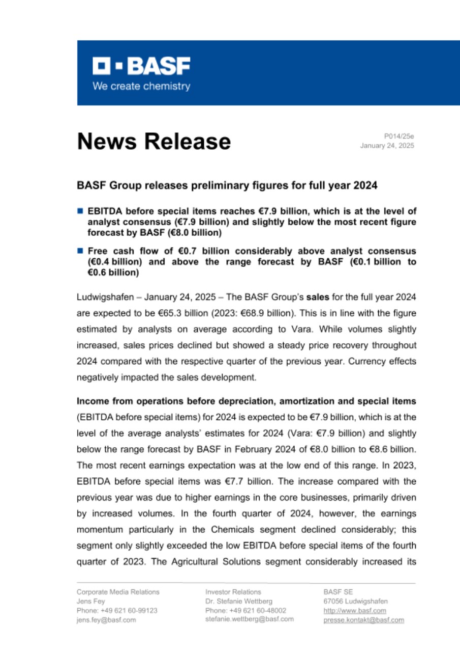 The financial figures of BASF Group for 2024 will be published on Friday, February 28, 2025. The conference call for analysts and investors is scheduled for that day from 9:30 a.m. to 10:30 a.m. CET, and the annual press conference for journalists will be held from 11:00 a.m. to noon CET. The audited BASF Report 2024 will be published on March 21, 2025.
