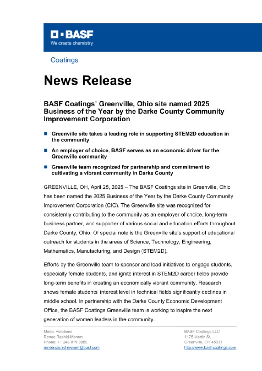 GREENVILLE, OH, April 25, 2025 – The BASF Coatings site in Greenville, Ohio has been named the 2025 Business of the Year by the Darke County Community Improvement Corporation (CIC). The Greenville site was recognized for consistently contributing to the community as an employer of choice, long-term business partner, and supporter of various social and education efforts throughout Darke County, Ohio. Of special note is the Greenville site’s support of educational outreach for students in the areas of Science, Technology, Engineering, Mathematics, Manufacturing, and Design (STEM2D).
