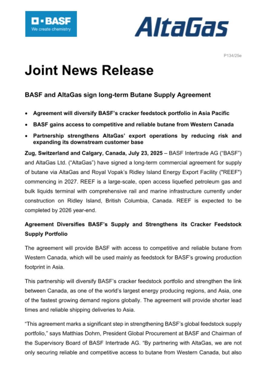 Zug, Switzerland and Calgary, Canada, July 23, 2025 – BASF Intertrade AG (“BASF”) and AltaGas Ltd. (“AltaGas”) have signed a long-term commercial agreement for supply of butane via AltaGas and Royal Vopak’s Ridley Island Energy Export Facility ("REEF") commencing in 2027. REEF is a large-scale, open access liquefied petroleum gas and bulk liquids terminal with comprehensive rail and marine infrastructure currently under construction on Ridley Island, British Columbia, Canada. REEF is expected to be completed by 2026 year-end.