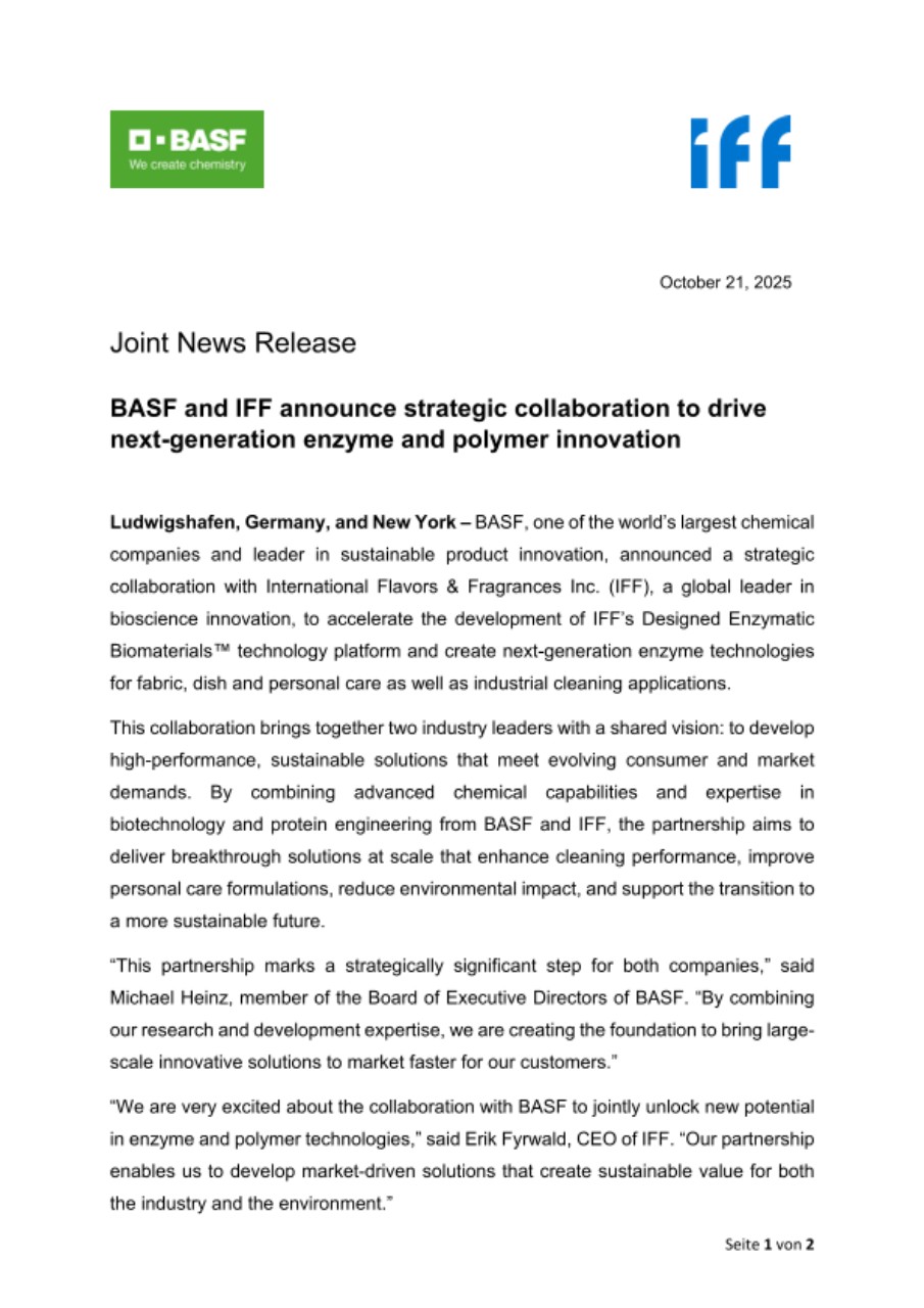 This collaboration brings together two industry leaders with a shared vision: to develop high-performance, sustainable solutions that meet evolving consumer and market demands. By combining advanced chemical capabilities and expertise in biotechnology and protein engineering from BASF and IFF, the partnership aims to deliver breakthrough solutions at scale that enhance cleaning performance, improve personal care formulations, reduce environmental impact, and support the transition to a more sustainable future.
