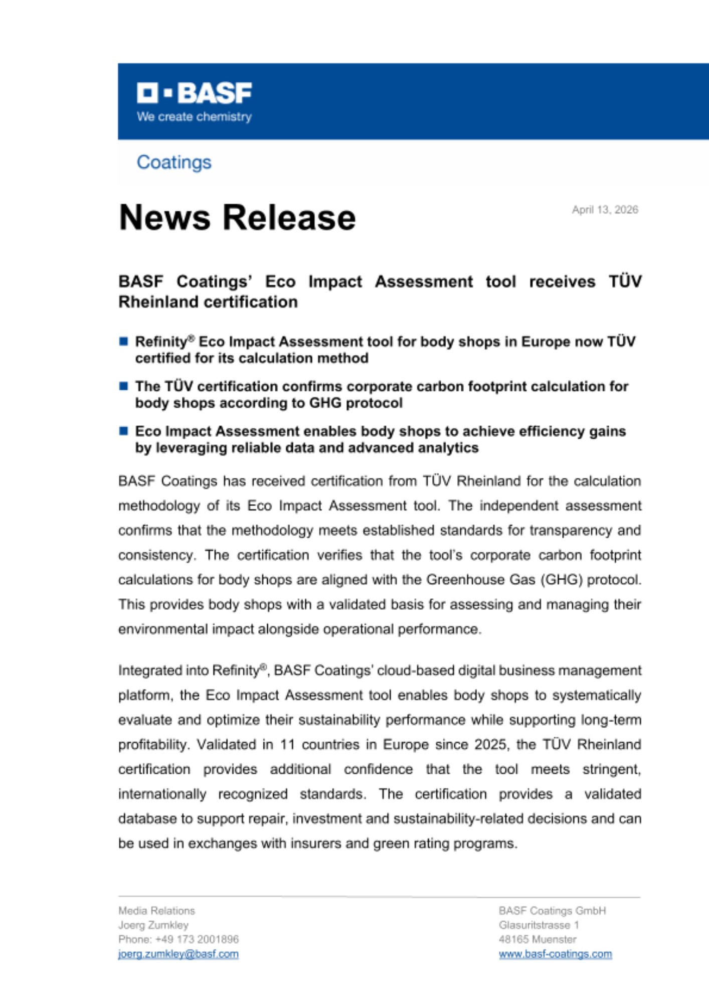 BASF Coatings has received certification from TÜV Rheinland for the calculation methodology of its Eco Impact Assessment tool. The independent assessment confirms that the methodology meets established standards for transparency and consistency. The certification verifies that the tool’s corporate carbon footprint calculations for body shops are aligned with the Greenhouse Gas (GHG) protocol. This provides body shops with a validated basis for assessing and managing their environmental impact alongside operational performance.