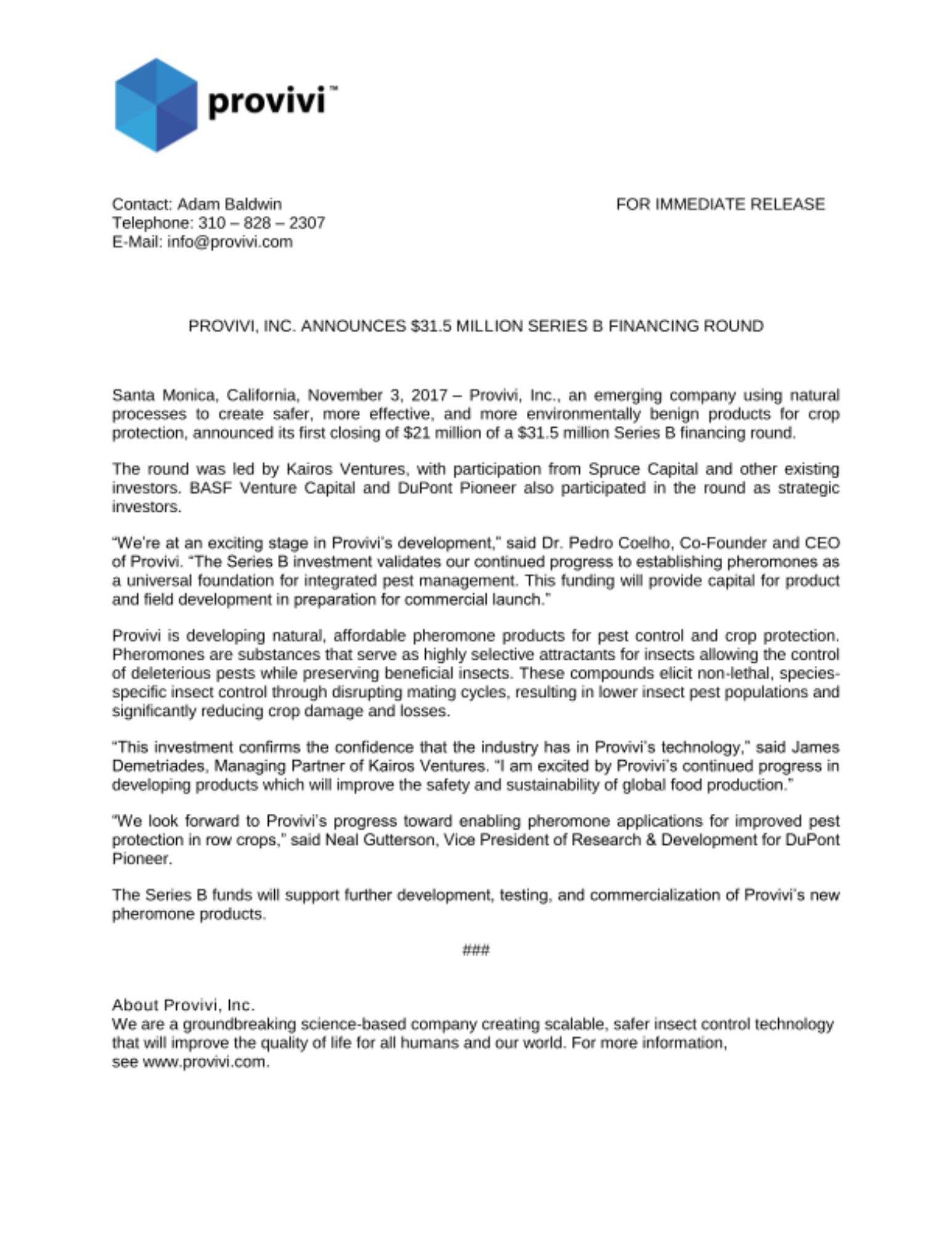 “This investment confirms the confidence that the industry has in Provivi’s technology,” said James Demetriades, Managing Partner of Kairos Ventures. “I am excited by Provivi’s continued progress in developing products which will improve the safety and sustainability of global food production.”