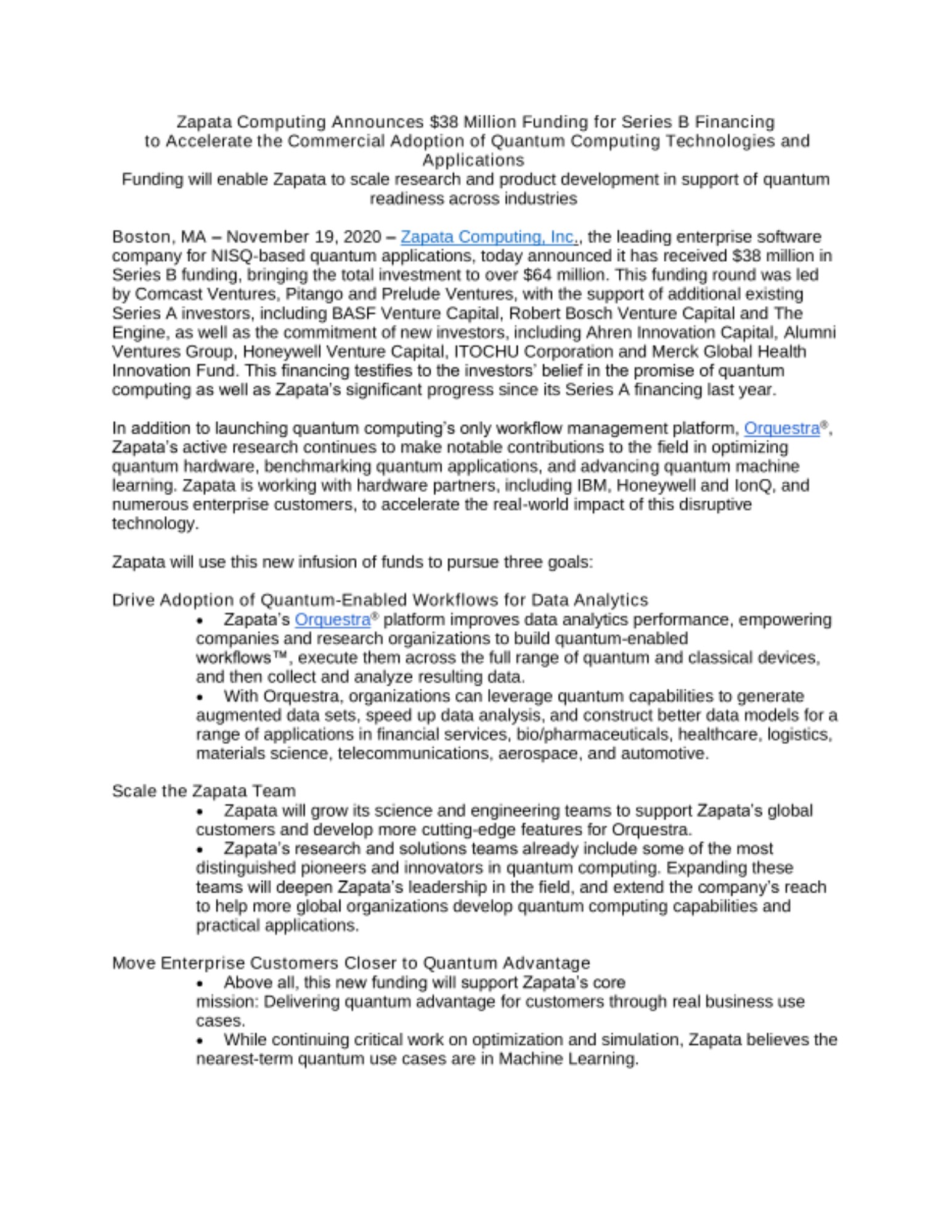 Boston, MA – November 19, 2020 – Zapata Computing, Inc., the leading enterprise software company for NISQ-based quantum applications, today announced it has received $38 million in Series B funding, bringing the total investment to over $64 million. This funding round was led by Comcast Ventures, Pitango and Prelude Ventures, with the support of additional existing Series A investors, including BASF Venture Capital, Robert Bosch Venture Capital and The Engine, as well as the commitment of new investors, including Ahren Innovation Capital, Alumni Ventures Group, Honeywell Venture Capital, ITOCHU Corporation and Merck Global Health Innovation Fund. This financing testifies to the investors’ belief in the promise of quantum computing as well as Zapata’s significant progress since its Series A financing last year.