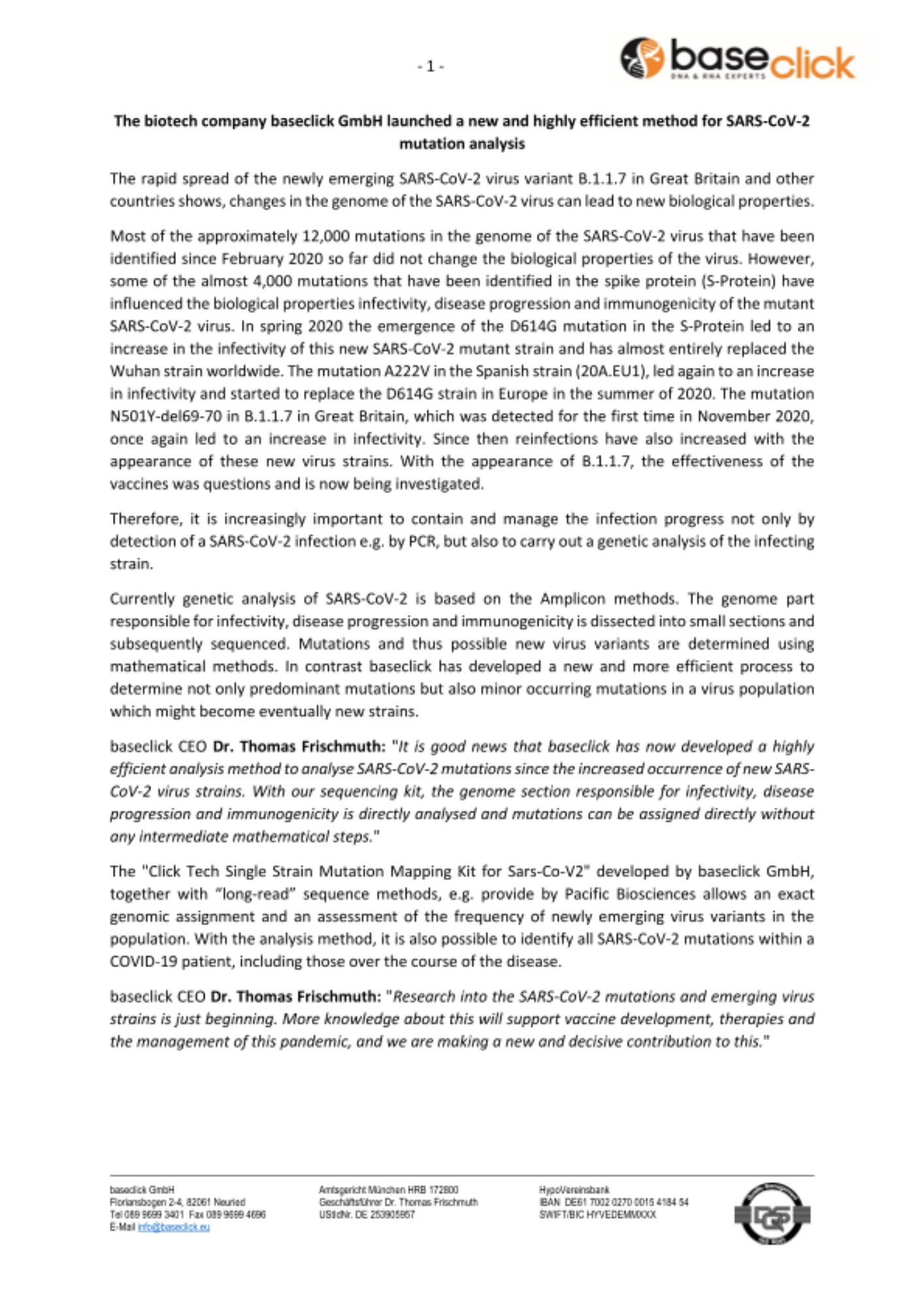 baseclick CEO Dr. Thomas Frischmuth: "It is good news that baseclick has now developed a highly efficient analysis method to analyse SARS-CoV-2 mutations since the increased occurrence of new SARS-CoV-2 virus strains. With our sequencing kit, the genome section responsible for infectivity, disease progression and immunogenicity is directly analysed and mutations can be assigned directly without any intermediate mathematical steps."
