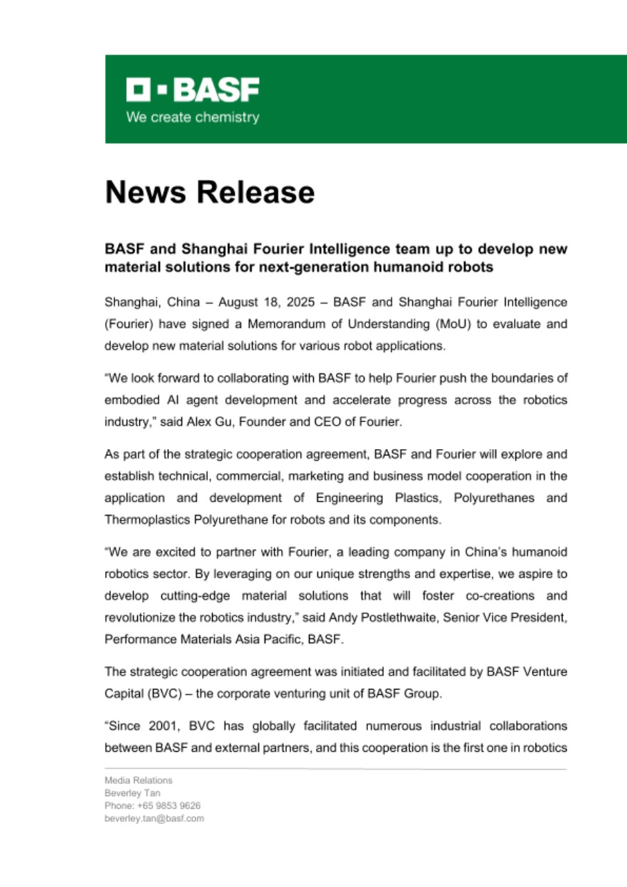 “We are excited to partner with Fourier, a leading company in China’s humanoid robotics sector. By leveraging on our unique strengths and expertise, we aspire to develop cutting-edge material solutions that will foster co-creations and revolutionize the robotics industry,” said Andy Postlethwaite, Senior Vice President, Performance Materials Asia Pacific, BASF.