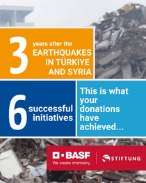 In addition to many local initiatives by colleagues in Türkiye, BASF SE donated EUR 500,000 in emergency aid to the German Red Cross and launched an employee giving campaign for mid‑term support. This raised more than EUR 844,000, which BASF SE doubled to EUR 2.1 million. Together with BASF representatives and local colleagues, BASF Stiftung deployed the funds for a package of support focused on two primary goals: