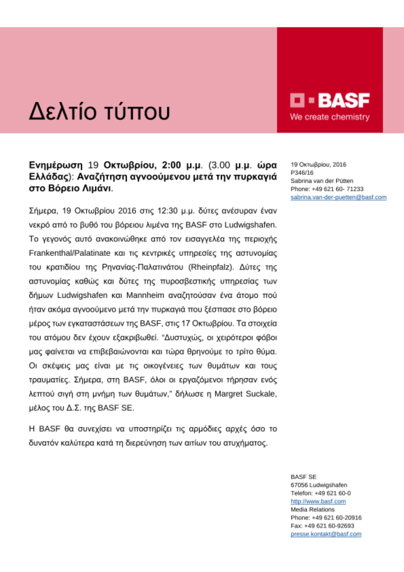 Η BASF θα συνεχίσει να υποστηρίζει τις αρμόδιες αρχές όσο το δυνατόν καλύτερα κατά τη διερεύνηση των αιτίων του ατυχήματος.