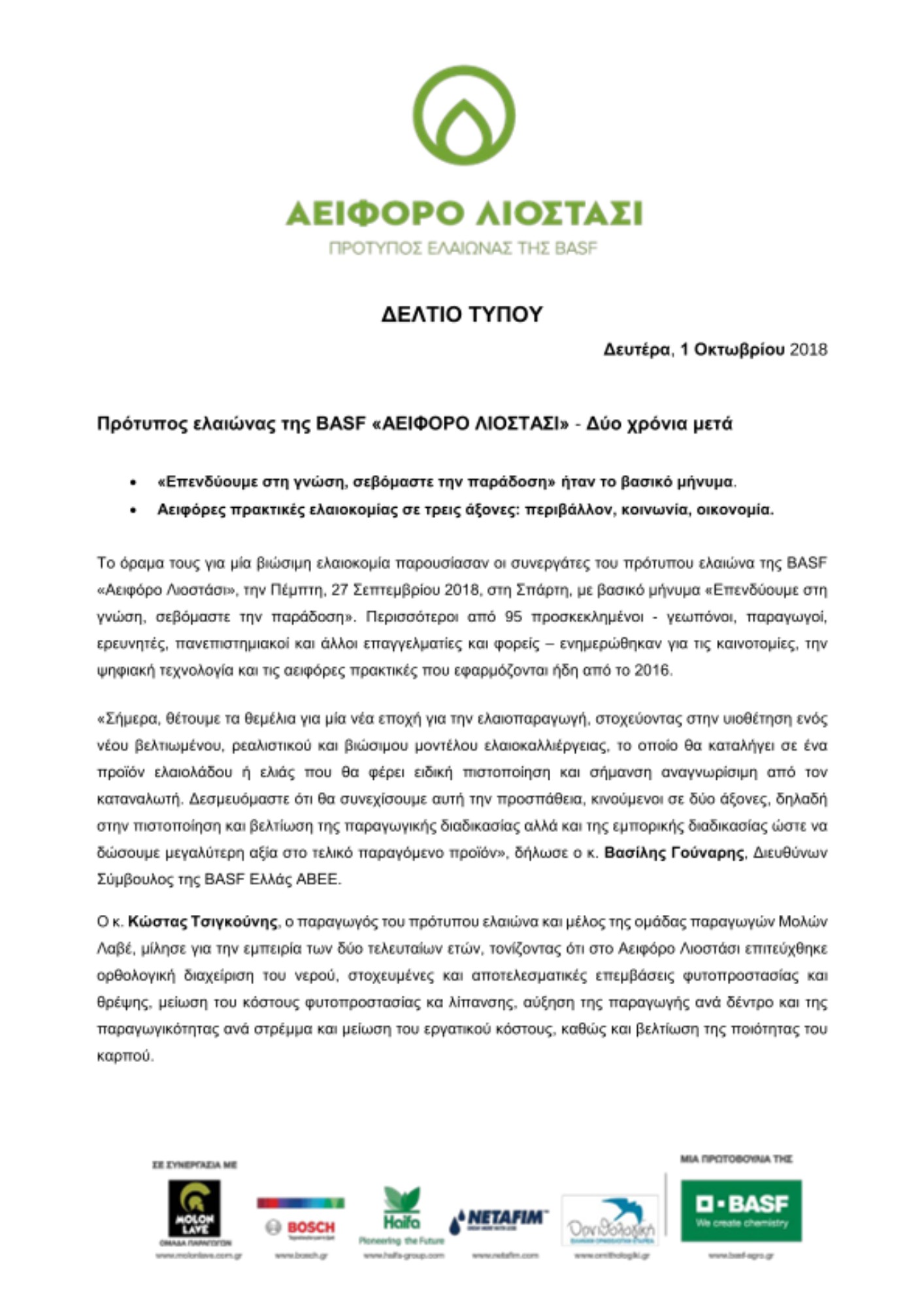 Το όραμα τους για μία βιώσιμη ελαιοκομία παρουσίασαν οι συνεργάτες του πρότυπου ελαιώνα της BASF «Αειφόρο Λιοστάσι», την Πέμπτη, 27 Σεπτεμβρίου 2018, στη Σπάρτη, με βασικό μήνυμα «Επενδύουμε στη γνώση, σεβόμαστε την παράδοση». Περισσότεροι από 95 προσκεκλημένοι - γεωπόνοι, παραγωγοί, ερευνητές, πανεπιστημιακοί και άλλοι επαγγελματίες και φορείς – ενημερώθηκαν για τις καινοτομίες, την ψηφιακή τεχνολογία και τις αειφόρες πρακτικές που εφαρμόζονται ήδη από το 2016.