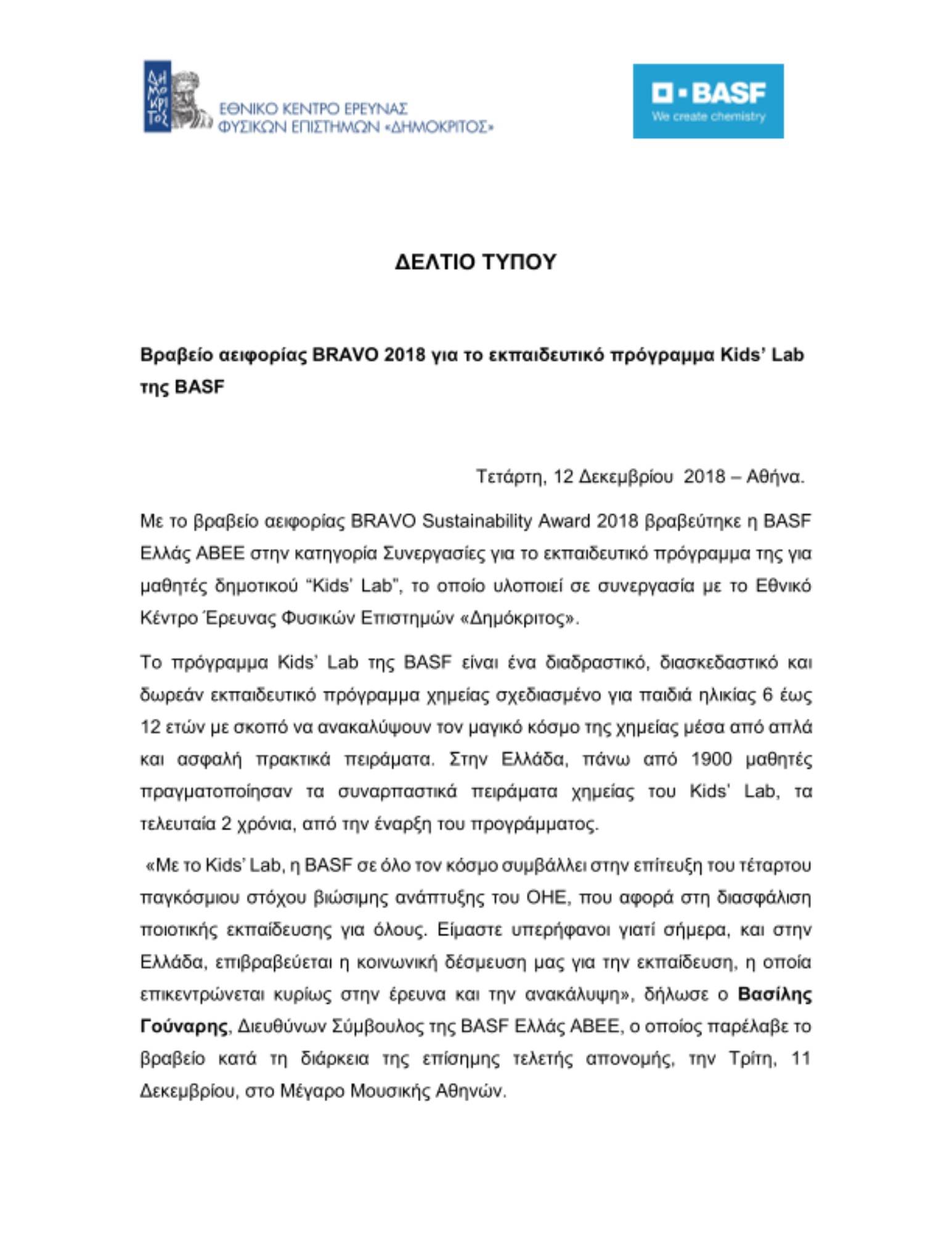 Με το βραβείο αειφορίας BRAVO Sustainability Award 2018 βραβεύτηκε η BASF Ελλάς ΑΒΕΕ στην κατηγορία Συνεργασίες για το εκπαιδευτικό πρόγραμμα της για μαθητές δημοτικού “Kids’ Lab”, το οποίο υλοποιεί σε συνεργασία με το Εθνικό Κέντρο Έρευνας Φυσικών Επιστημών «Δημόκριτος».
