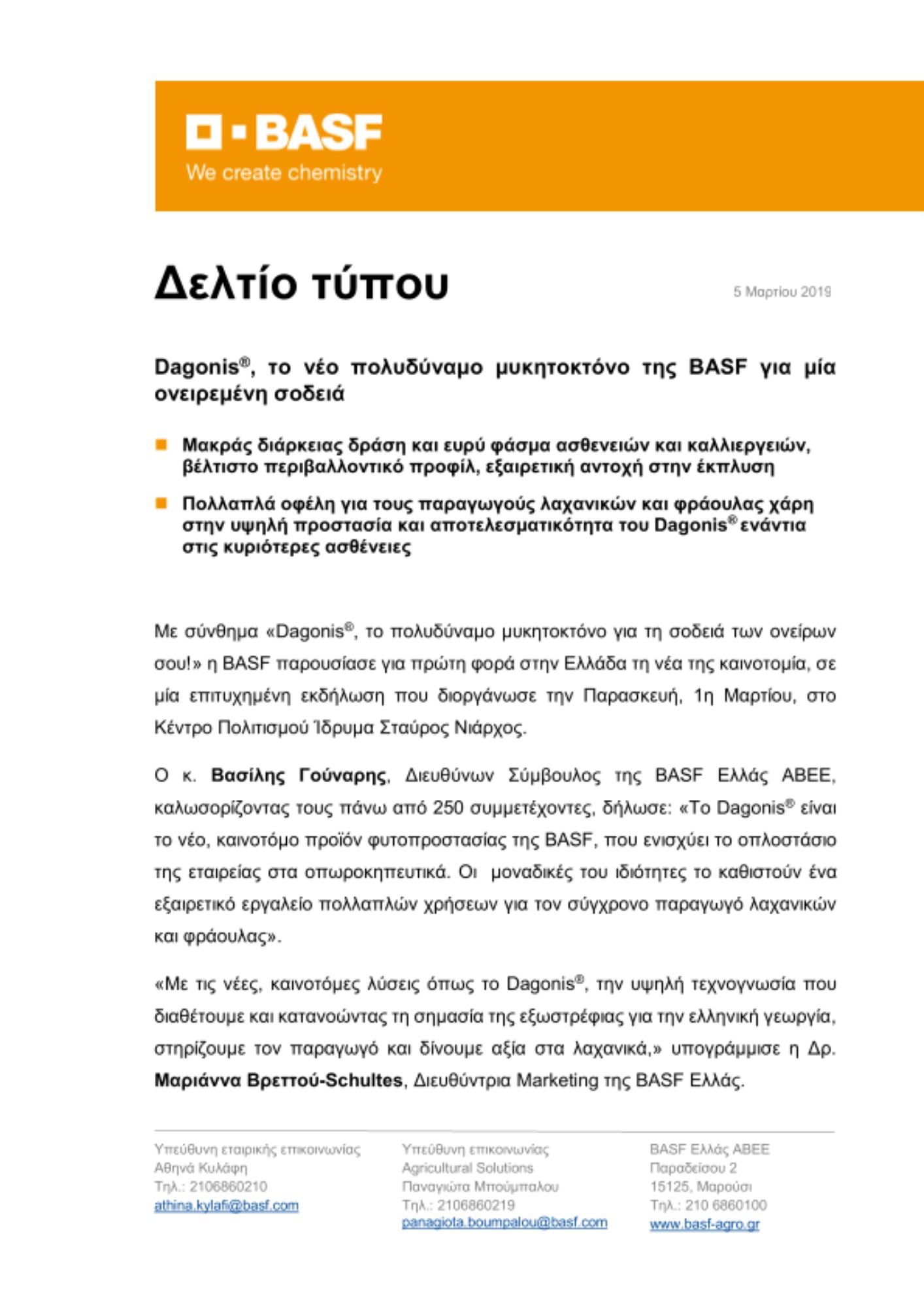 Με σύνθημα «Dagonis®, τo πολυδύναμο μυκητοκτόνο για τη σοδειά των ονείρων σου!» η BASF παρουσίασε για πρώτη φορά στην Ελλάδα τη νέα της καινοτομία, σε μία επιτυχημένη εκδήλωση που διοργάνωσε την Παρασκευή, 1η Μαρτίου, στο Κέντρο Πολιτισμού Ίδρυμα Σταύρος Νιάρχος.