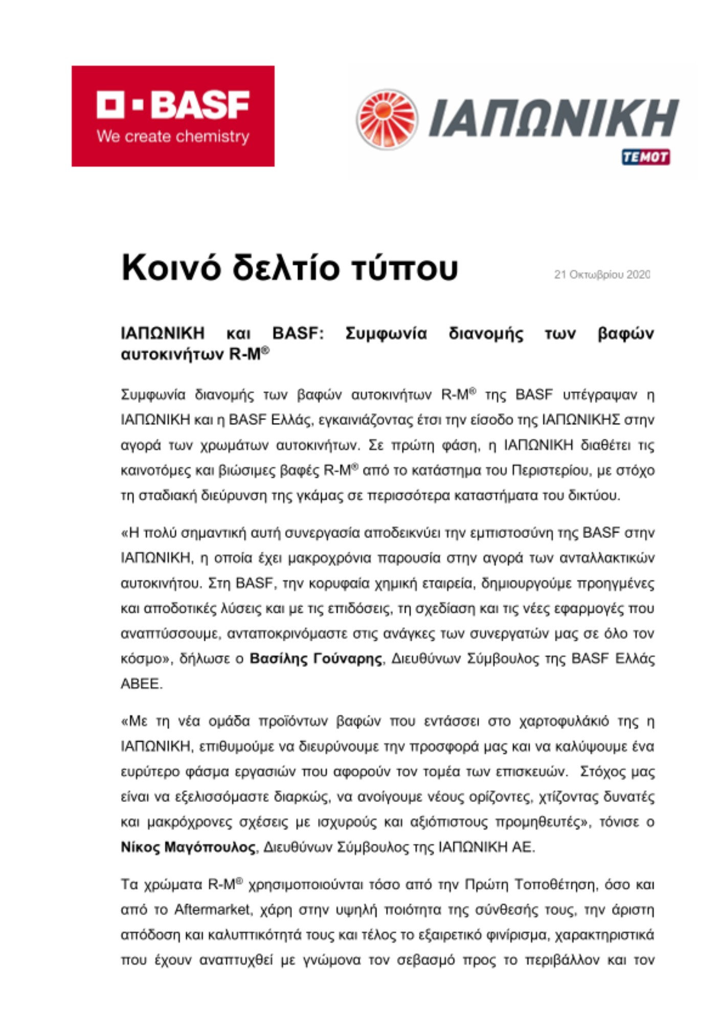 Συμφωνία διανομής των βαφών αυτοκινήτων R-M® της BASF υπέγραψαν η ΙΑΠΩΝΙΚΗ και η BASF Ελλάς, εγκαινιάζοντας έτσι την είσοδο της ΙΑΠΩΝΙΚΗΣ στην αγορά των χρωμάτων αυτοκινήτων. Σε πρώτη φάση, η ΙΑΠΩΝΙΚΗ διαθέτει τις καινοτόμες και βιώσιμες βαφές R-M® από το κατάστημα του Περιστερίου, με στόχο τη σταδιακή διεύρυνση της γκάμας σε περισσότερα καταστήματα του δικτύου.