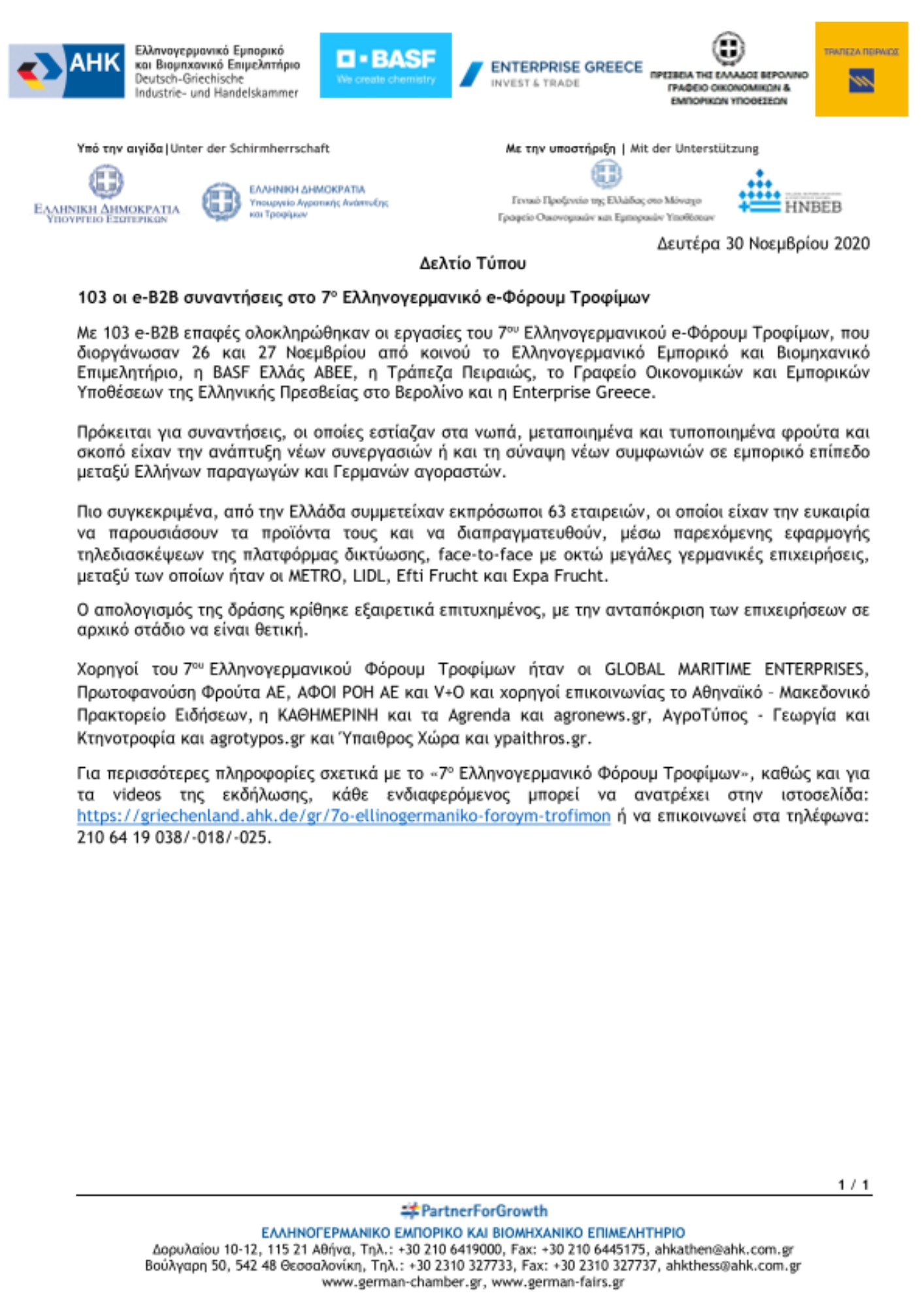 Με 103 e-B2B επαφές ολοκληρώθηκαν οι εργασίες του 7ου Ελληνογερμανικού e-Φόρουμ Τροφίμων, που διοργάνωσαν 26 και 27 Νοεμβρίου από κοινού το Ελληνογερμανικό Εμπορικό και Βιομηχανικό Επιμελητήριο, η BASF Ελλάς ΑΒΕΕ, η Τράπεζα Πειραιώς, το Γραφείο Οικονομικών και Εμπορικών Υποθέσεων της Ελληνικής Πρεσβείας στο Βερολίνο και η Enterprise Greece.