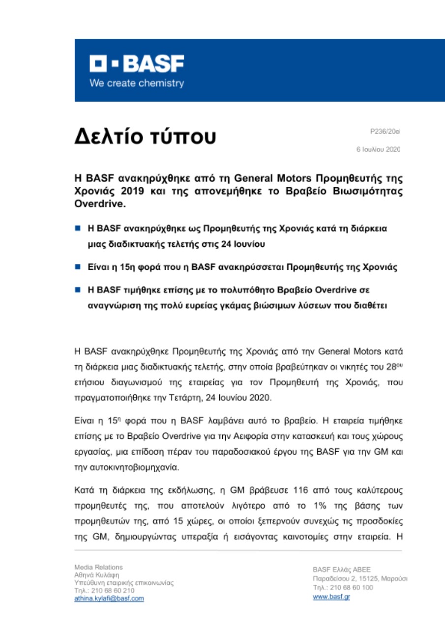 Η BASF ανακηρύχθηκε Προμηθευτής της Χρονιάς από την General Motors κατά τη διάρκεια μιας διαδικτυακής τελετής, στην οποία βραβεύτηκαν οι νικητές του 28ου ετήσιου διαγωνισμού της εταιρείας για τον Προμηθευτή της Χρονιάς, που πραγματοποιήθηκε την Τετάρτη, 24 Ιουνίου 2020.