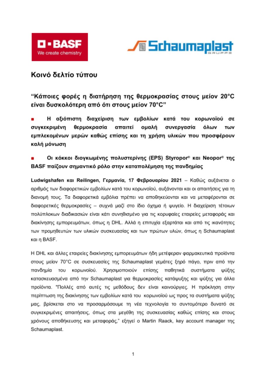Ludwigshafen και Reilingen, Γερμανία, 17 Φεβρουαρίου 2021 – Καθώς αυξάνεται ο αριθμός των διαφορετικών εμβολίων κατά του κορωνοϊού, αυξάνονται και οι απαιτήσεις για τη διανομή τους. Τα διαφορετικά εμβόλια πρέπει να αποθηκεύονται και να μεταφέρονται σε διαφορετικές θερμοκρασίες – συχνά μαζί στο ίδιο όχημα ή ψυγείο. Η διαχείριση τέτοιων πολύπλοκων διαδικασιών είναι κάτι συνηθισμένο για τις κορυφαίες εταιρείες μεταφοράς και διακίνησης εμπορευμάτων, όπως η DHL. Αλλά η επιτυχία εξαρτάται και από τις ικανότητες των προμηθευτών των υλικών συσκευασίας και των πρώτων υλών, όπως η Schaumaplast και η BASF.