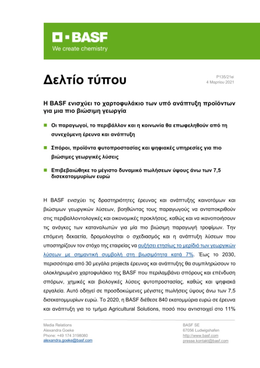 Η BASF ενισχύει τις δραστηριότητες έρευνας και ανάπτυξης καινοτόμων και βιώσιμων γεωργικών λύσεων, βοηθώντας τους παραγωγούς να ανταποκριθούν στις περιβαλλοντολογικές και οικονομικές προκλήσεις, καθώς και να ικανοποιήσουν τις ανάγκες των καταναλωτών για μία πιο βιώσιμη παραγωγή τροφίμων. Την επόμενη δεκαετία, δρομολογείται ο σχεδιασμός και η ανάπτυξη λύσεων που υποστηρίζουν τον στόχο της εταιρείας να αυξήσει ετησίως το μερίδιό των γεωργικών λύσεων με σημαντική συμβολή στη βιωσιμότητα κατά 7%. Έως το 2030, περισσότερα από 30 μεγάλα projects έρευνας και ανάπτυξης θα συμπληρώσουν το ολοκληρωμένο χαρτοφυλάκιο της BASF που περιλαμβάνει σπόρους και επένδυση σπόρων, χημικές και βιολογικές λύσεις φυτοπροστασίας καθώς και ψηφιακά εργαλεία. Αυτό οδηγεί σε προσδοκώμενες μέγιστες πωλήσεις ύψους άνω των 7,5 δισεκατομμυρίων ευρώ. Το 2020, η BASF διέθεσε 840 εκατομμύρια ευρώ σε έρευνα και ανάπτυξη για το τμήμα Agricultural Solutions, ποσό που αντιστοιχεί στο 11% περίπου των πωλήσεων του αντίστοιχου τομέα. Το 2021, η εταιρεία θα συνεχίσει να επενδύει σε ανάπτυξη γεωργικών καινοτομιών σε υψηλό επίπεδο.