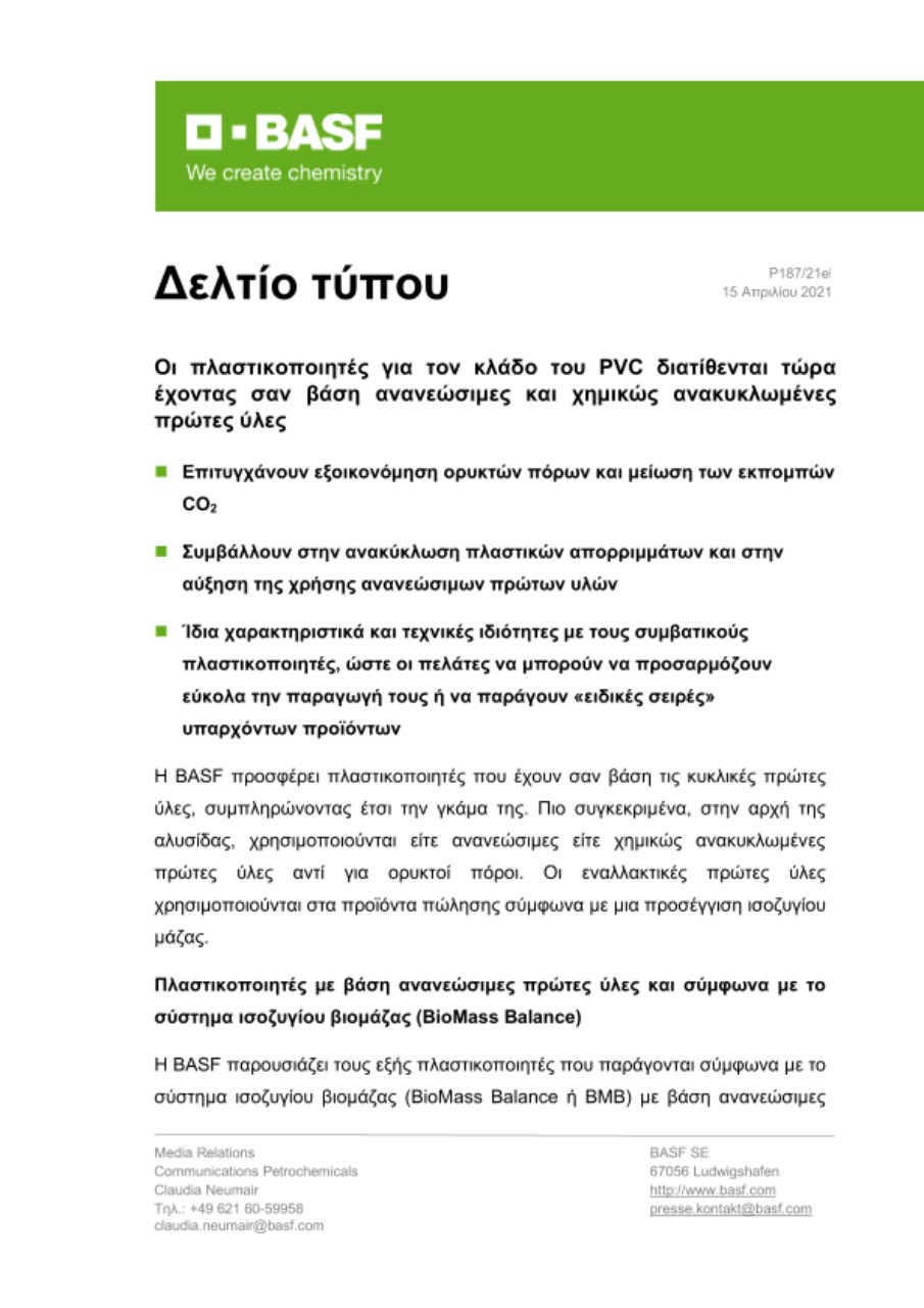 «Οι πελάτες μας αντιμετωπίζουν αυξανόμενη ζήτηση για προϊόντα που παράγονται με αποδοτική χρήση των πόρων», λέει ο Δρ. Matthias Pfeiffer, επικεφαλής τεχνικού μάρκετινγκ πλαστικοποιητών EMEA. «Με αυτά τα προϊόντα προσφέρουμε μια πιο βιώσιμη λύση και κάνουμε άλλο ένα βήμα προς την κυκλική οικονομία».