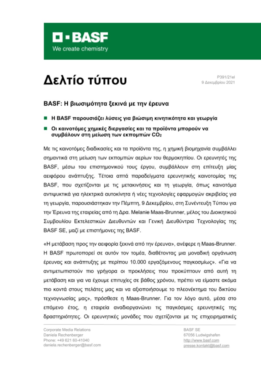 Με τις καινοτόμες διαδικασίες και τα προϊόντα της, η χημική βιομηχανία συμβάλλει σημαντικά στη μείωση των εκπομπών αερίων του θερμοκηπίου. Οι ερευνητές της BASF, μέσω του επιστημονικού τους έργου, συμβάλλουν στη επίτευξη μίας αειφόρου ανάπτυξης. Τέτοια απτά παραδείγματα ερευνητικής καινοτομίας της BASF, που σχετίζονται με τις μετακινήσεις και τη γεωργία, όπως καινοτόμα αντιψυκτικά για ηλεκτρικά αυτοκίνητα ή νέες τεχνολογίες εφαρμογών ακριβείας για τη γεωργία, παρουσιάστηκαν την Πέμπτη, 9 Δεκεμβρίου, στη Συνέντευξη Τύπου για την Έρευνα της εταιρείας από τη Δρα. Melanie Maas-Brunner, μέλος του Διοικητικού Συμβουλίου Εκτελεστικών Διευθυντών και Γενική Διευθύντρια Τεχνολογίας της BASF SE, μαζί με επιστήμονες της BASF.