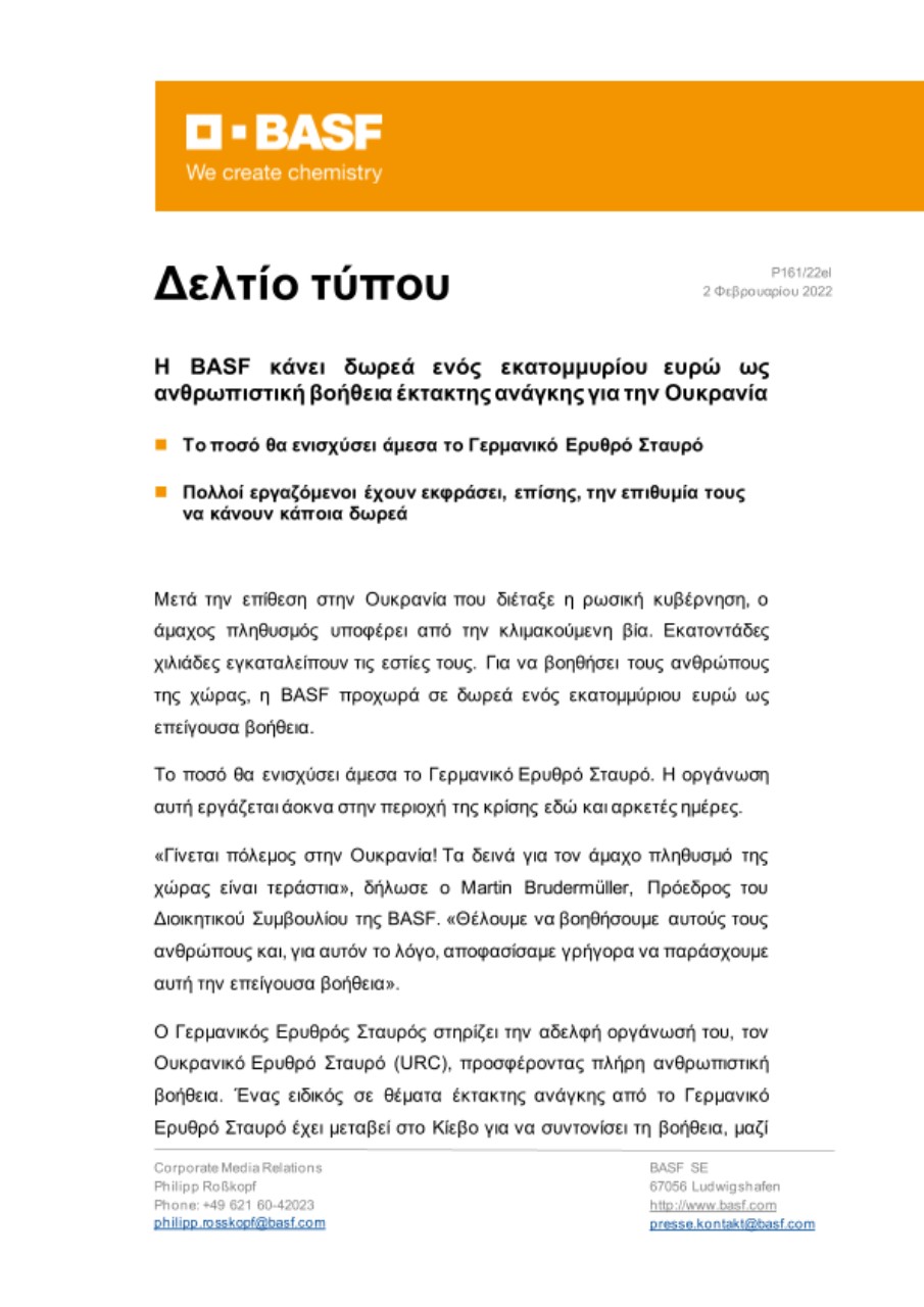 «Γίνεται πόλεμος στην Ουκρανία! Τα δεινά για τον άμαχο πληθυσμό της χώρας είναι τεράστια», δήλωσε ο Martin Brudermüller, Πρόεδρος του Διοικητικού Συμβουλίου της BASF. «Θέλουμε να βοηθήσουμε αυτούς τους ανθρώπους και, για αυτόν το λόγο, αποφασίσαμε γρήγορα να παράσχουμε αυτή την επείγουσα βοήθεια».