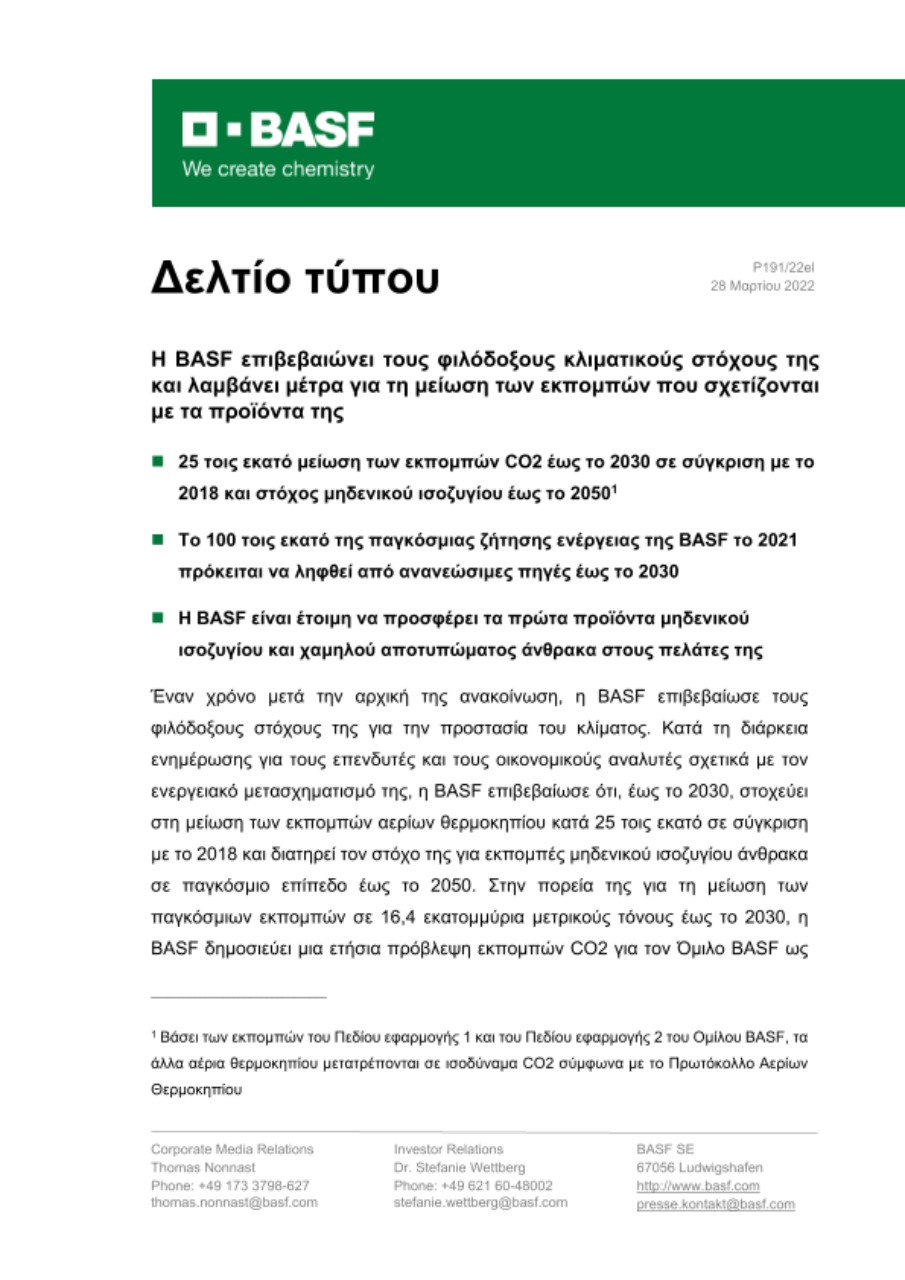 Η BASF επιβεβαιώνει τους φιλόδοξους κλιματικούς στόχους της και λαμβάνει μέτρα για τη μείωση των εκπομπών που σχετίζονται με τα προϊόντα της