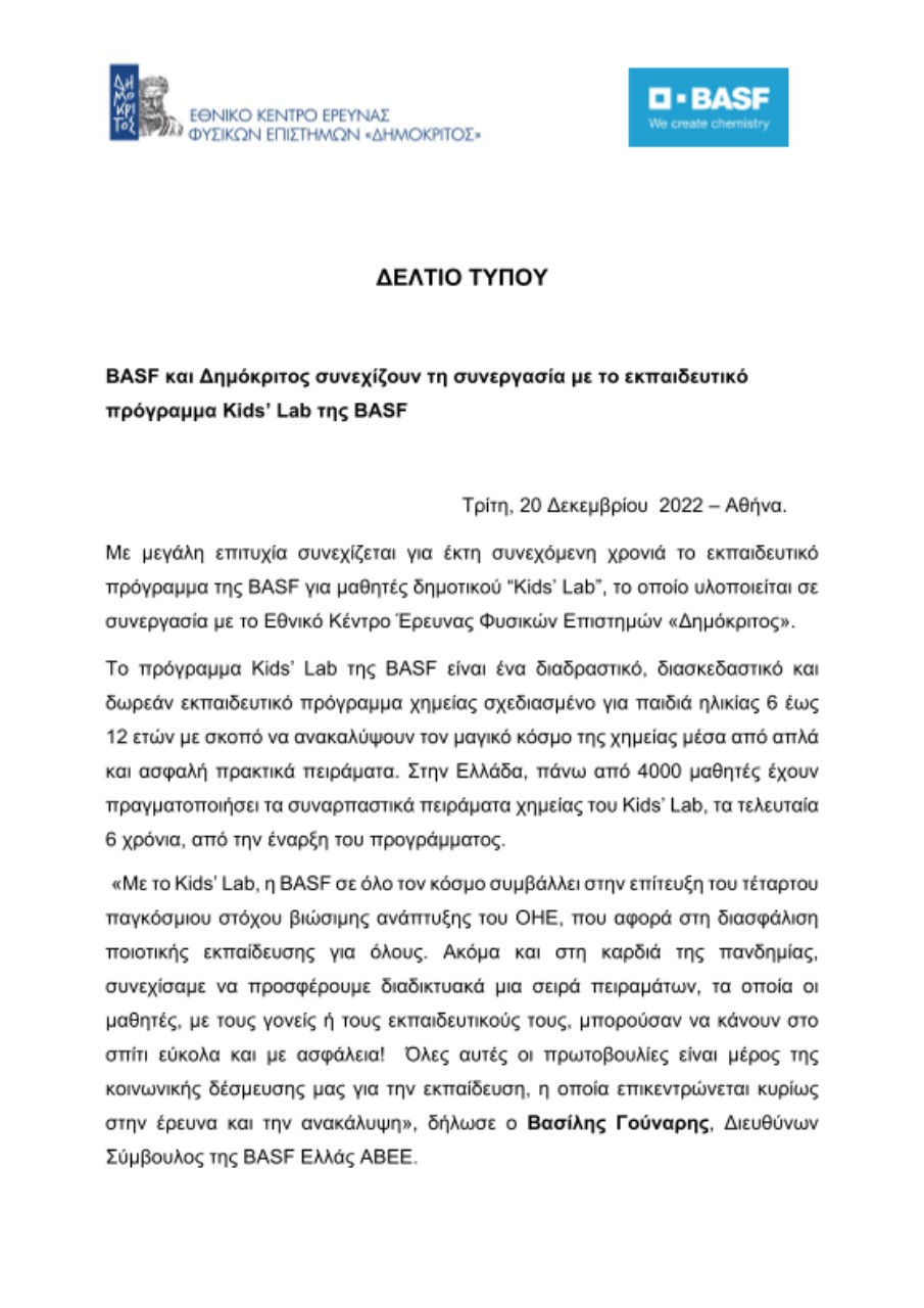 BASF και Δημόκριτος συνεχίζουν τη συνεργασία με το εκπαιδευτικό πρόγραμμα Kids’ Lab της BASF